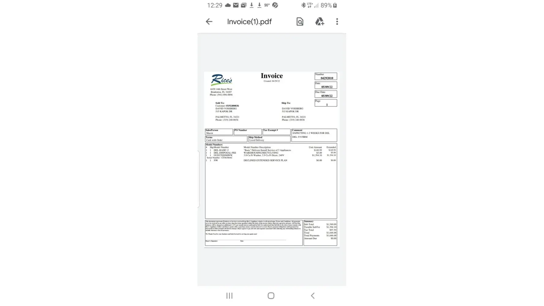 9/19/22 for $3,500, Model#: PVD28BYNCFS, Serial#: LT547790.