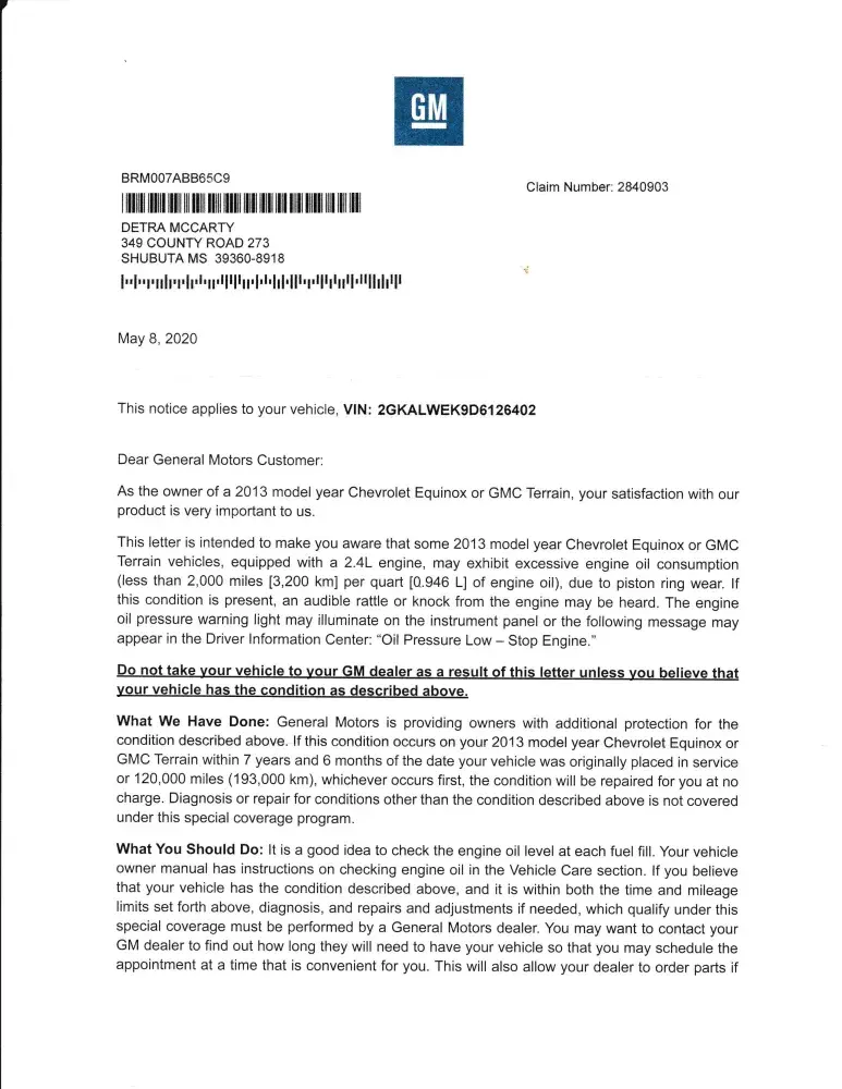 I received a letter dated may 8, saying that my car may be experiencing these problems. Bit when I contacted gm they said that the service repair had already expired. Bit to contact local dealer and the liaison would work with me. Spoke to liaison, she told me to drop off car and they would diagnose problem. If it was diagnosed as a gm problem that gm would...