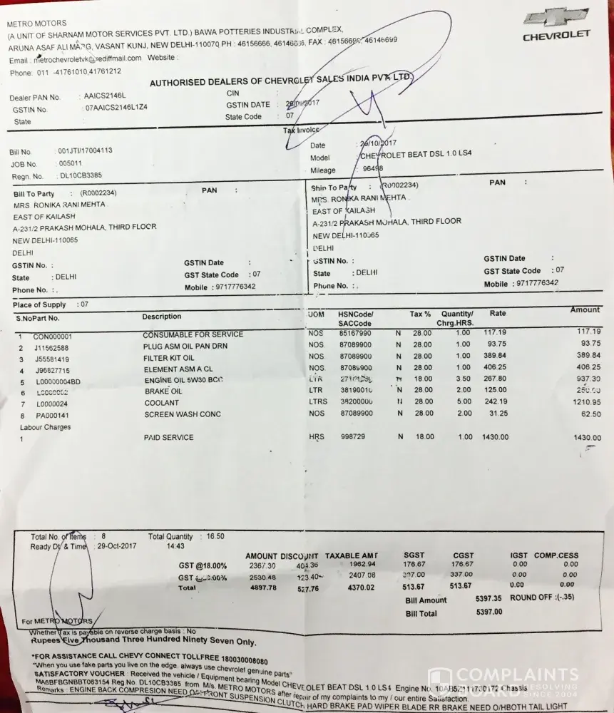 I have bough Beat LS (diesel) car in Dec 2011 and got all services from cheverelet authorised service centre till apr 17 and my complaint is as follows below:-