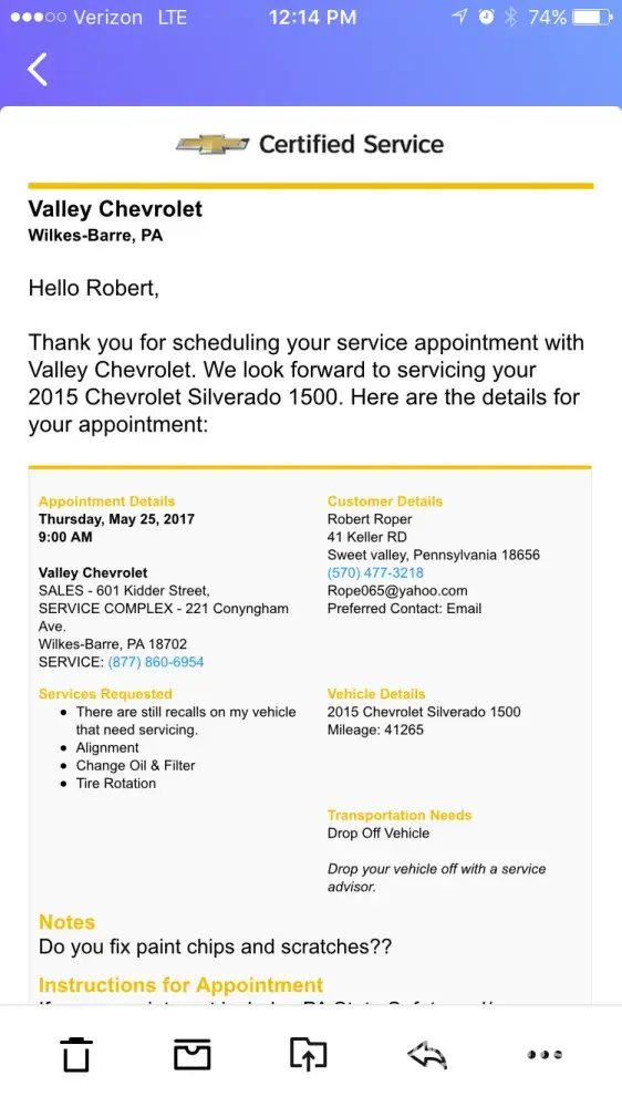 On may 19 I submitted an appointment for oil change, rotation, paint repair and alignment to which I received a confirmation email which I can provide. My appointment was for may 25 at 9 am, I dropped off the truck overnight. At 12:30 I called to see the progress of my appointment and the individual on the phone tells me that my truck hasn't even been touched and no one has record of my appointment. So that tells me that they picked up my keys in the Dropbox this morning and just discarded my information instead of calling and explaining the situation. The alignment wasn't completed nor the paint repair and now the truck pulls worse than ever. The individual handling this was ignorant and only could tell me that he guesses the internet is down. Now I've had multiple problems with this organization as a whole in the past dealing with the GM Financial department and now the individual dealership/service department. You truly do not value customers or their needs. Something better be done to remedy all this or my next complaint will be with the Better business bureau or higher. Being treated like this is ridiculous.