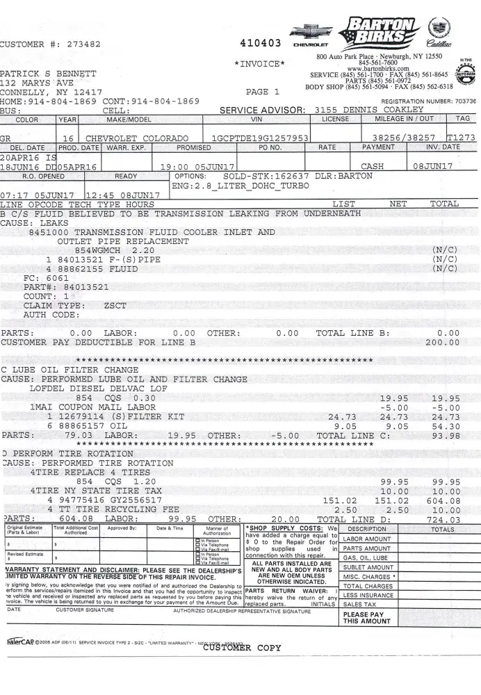 6-5-17 received a call from Barton that a Coolant Line from the Transmission to the cooler had failed, They ordered the parts and replaced the lines and I received my Colorado Back on 6-8-17.