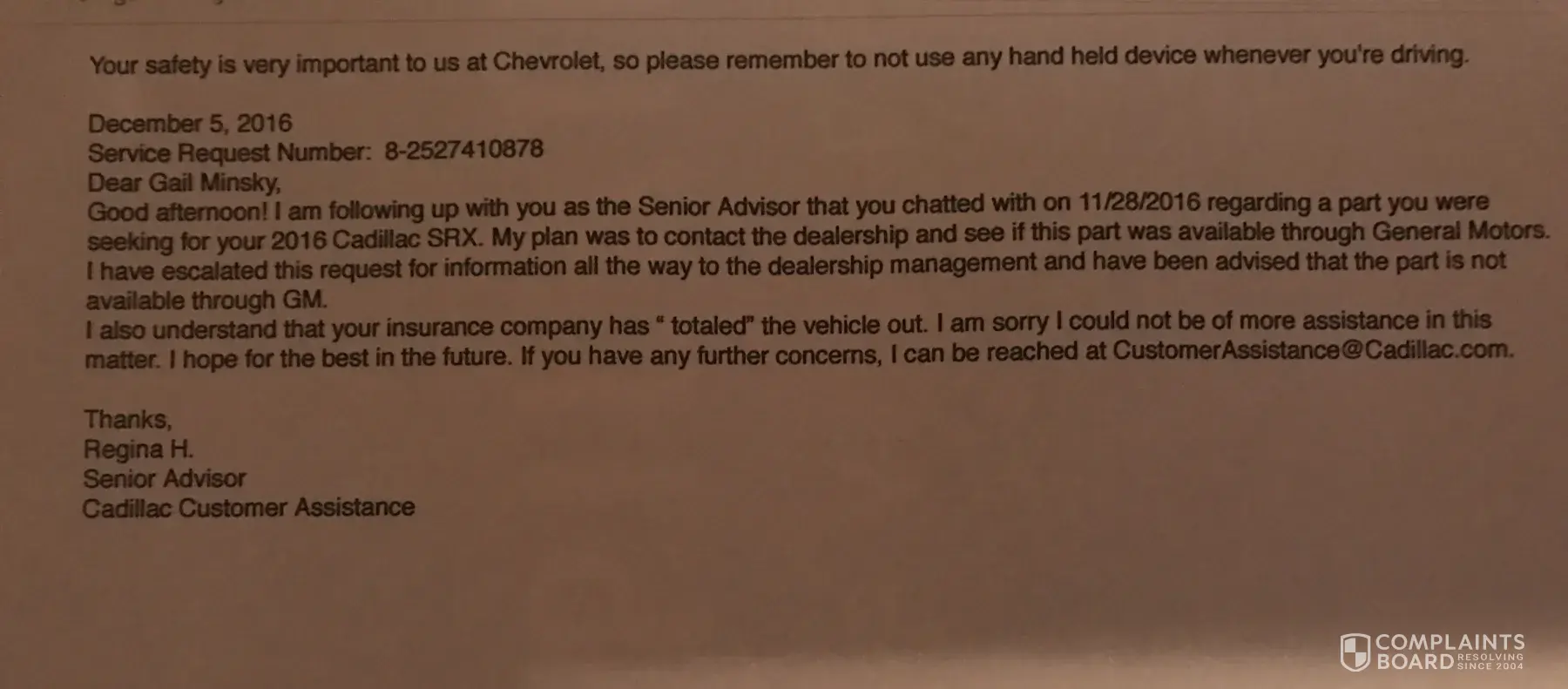 We leased a 2016 Cadillac SRX in July 2016. One month later, we were rear ended. The damage to the SRX was estimated at around $14, 000. The collision center needed one final part to begin the repairs. It's been over 3 months and they are still unable to get the part from GM. There have been 6 promised delivery dates that have all fallen through. GM has failed to provide any information about this part and its availability. Because they cannot deliver the part or say when or if it will ever be delivered, the car is going to be considered a total loss. We chose to buy an American made car thinking that parts would always be available. We are so disappointed in GM and their failure to provide parts for the cars they manufacture and sell. We will lose about $8, 000 for the 4 weeks we were able to drive this car.