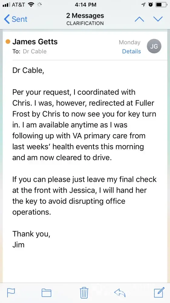 Further evidence of his discriminatory practices, dr cable cites that he found a draft file copy of a resignation letter dated 22 august 2018.in this draft for my eyes only, I cited that my reserve unit is set to mobilize in fy19 and that I would like to consider (at the time) a resignation date effecting september 7, 2018. This letter was in my personal files, not intended for communication until a later date, not signed by me, and not sent, printed, or communicated to dr. Cable in any form or fashion. During the period of when I was under emergency medical care, dr. Cable decided to "discover" this document and further show his discrimination against military members and families by using my reasons of a fy19 mobilization as a reason to immediately expedite my termination and replacement (proof in text/email form from dr cable), thus not allowing me to work even the proposed (draft) intent of working until september 7, 2018.