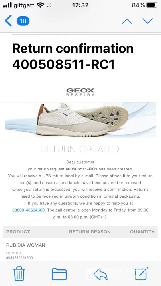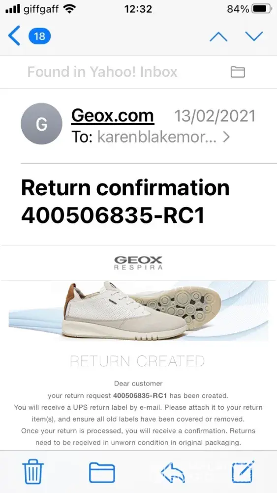 I have attached photos of ups text proving my return of 2 pairs of trainers on the 13th and 20th February. I have emailed GEOX but still not received my refund. I returned them whin a day of receiving them as they were both the wrong size, unworn. You can see evidence of both products with their codes as screen shots and a screen shot of both ups texts which prove that I returned the shoes promptly. I am not rich and waiting for the refund to buy trainers for work and need this money. I have never experienced such poor service and feel very disappointed in GEOX as they are supposed a better class company selling quality shoes, this is not classy it is cheap to keep the money of customers and they have evidently done this many times.