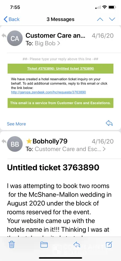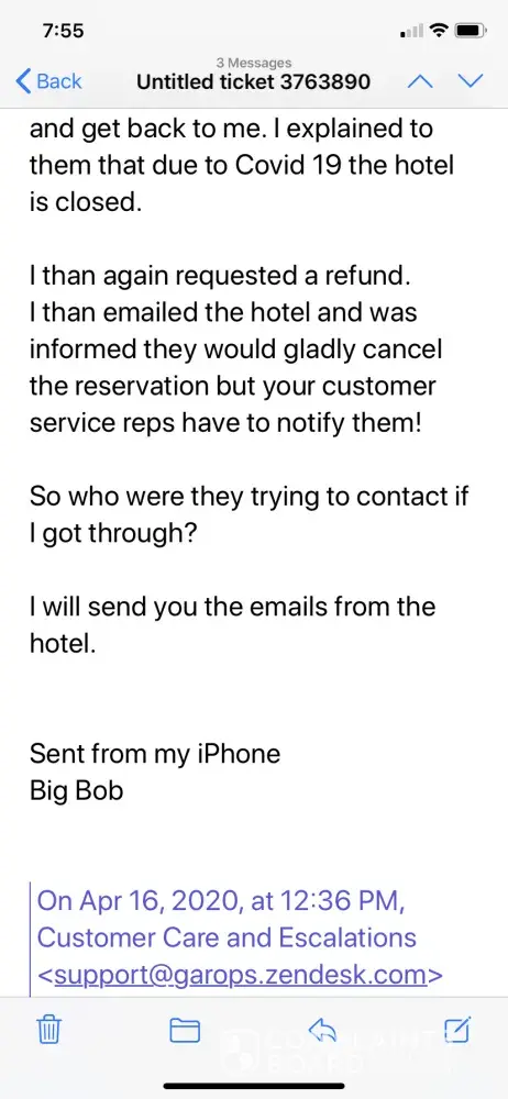 I also sent requests to cancel through an email link in my original booking confirmation to their Customer Care and Escalations Zendesk site on 3/14, 3/17 and 3/21 and received a ticket number 3653589, but no follow up from the company.