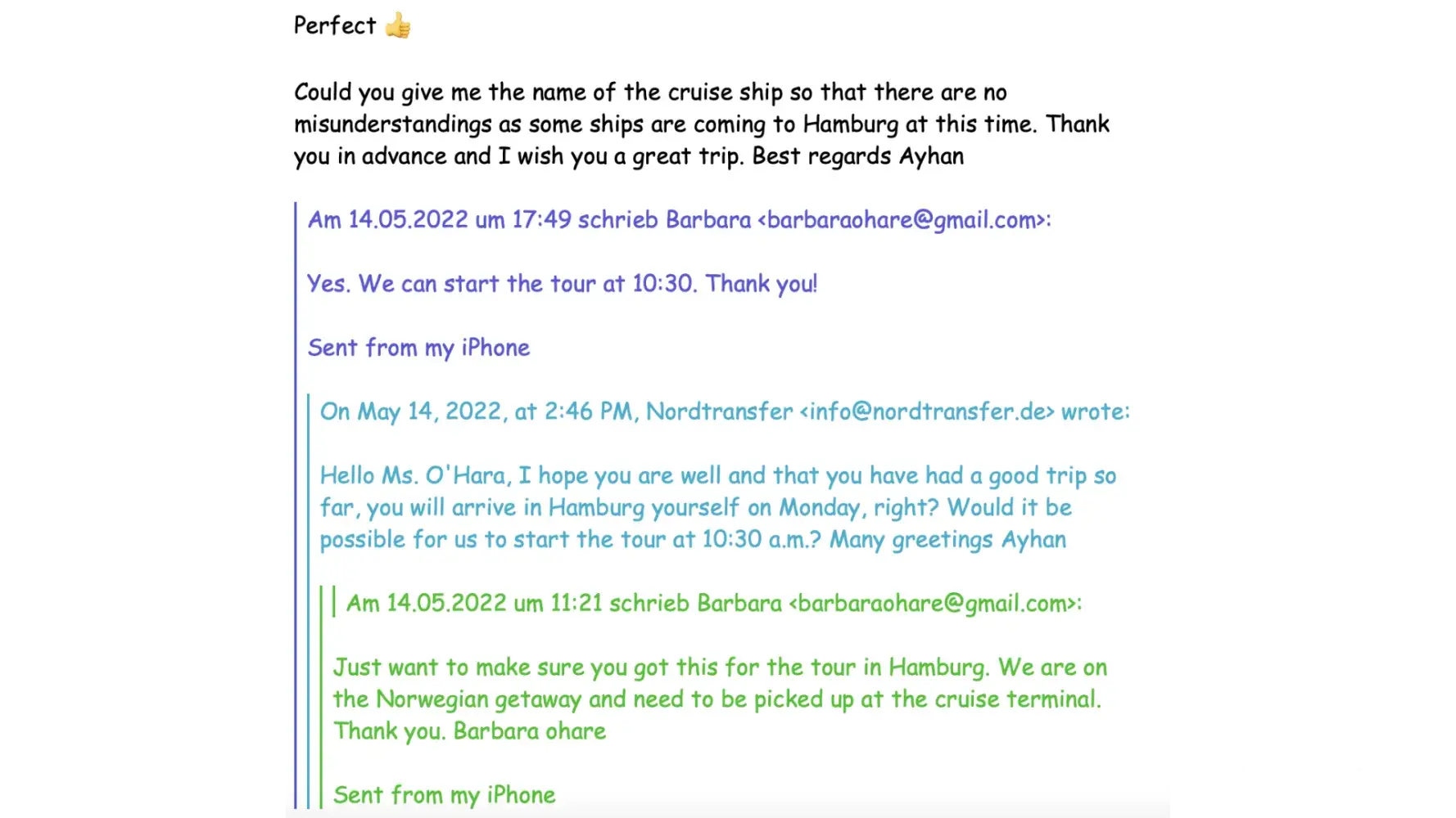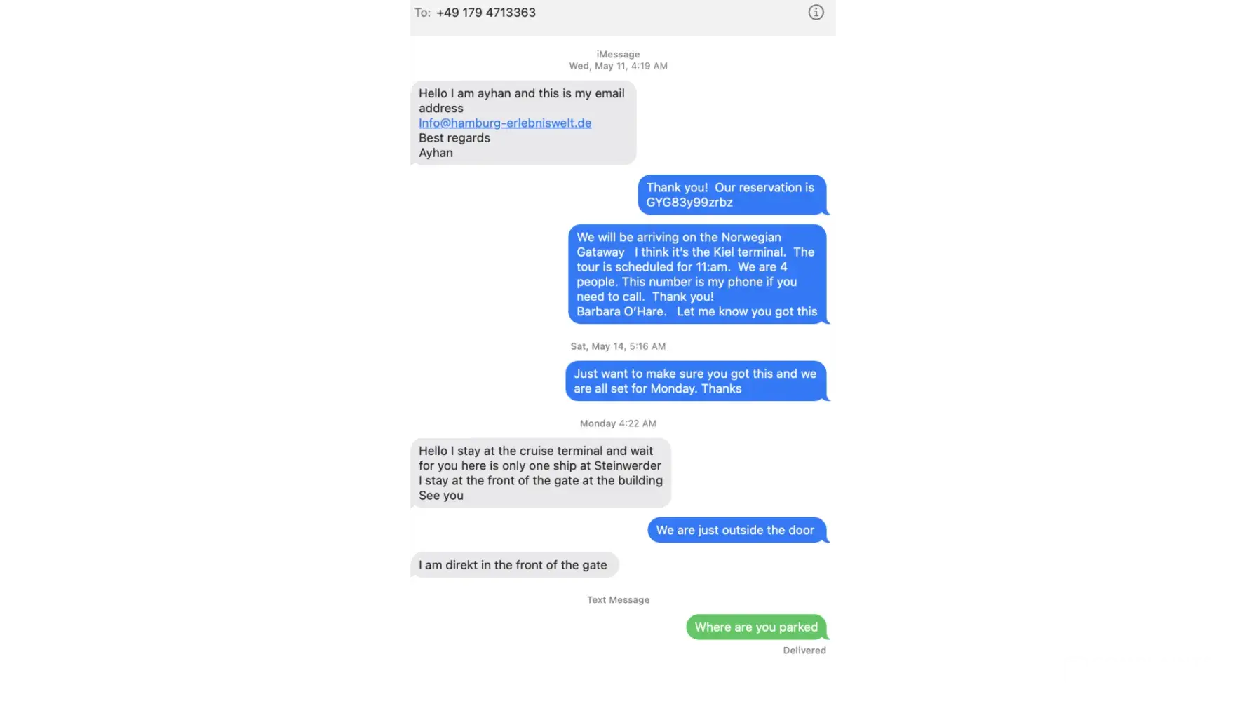 Booked 3 hour Limo tour of Hamburg for May 16, 2022 for $540.00. Tried to set the pickup location on the app and answering emails, but I kept getting emails. Finally was able to email, text and talk with the driver. I told him I didn't know the area and to suggest a place and I told him we were coming into the cruise port and he agreed to get me there. I texted him that it was the Kiel Cruise port and gave the information about the ship. He asked me to move the tour from 11am to 10:30am, which I agreed to. When we docked he was not there. I called and he said he was at the port, but he was at the wrong port. He said he was over an hour away and could not do the tour because of the time factor. He promised to have "the lady at the office" call me, which, of course, she never did. After contacting GYG and Paypal, I received communication that I had cancelled the tour and their policy says no refund if you cancel the tour on the day of, but they were going to make an exception and refund me 50%. I did not cancel this tour. They did by not showing up. Their driver agreed to pick us up at Kiel and he did not show up.