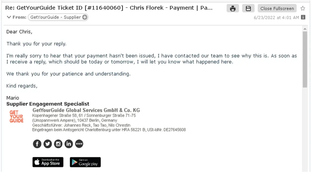 An extremely disorganized company, very disappointing customer service, lack of integrity, GetYourGuide is only looking to make quick revenue and all stops here. We have terminated our relationship with GetYourGuide 3 months ago due to constant issues, GetYourGuide didn't assist their customer to make a reservation and purchase admission tickets for our tour, they just sent us an email that the customer couldn't make a booking, even thou they saw that we have availability and they just don't know why their system didn't accept the reservation. When we have inquired for additional information to remedy the future issues, the clear answer has never been provided and no solution was offered. Overall very poor customer service, you can ONLY contact them via Contact Form on their website, but you only have 7 options to choose from, so if your inquiry falls outside of these 7 options, you simply are unable to contact them. When you select option other than your issue, then they 1st keep forwarding your emails to other departments that can't assist you anyway, so 3 days goes by and you need to open another "ticket" because no one is able to help you. When we finally decided to stop working with GetYourGuide due to several issues and horrible customer service, we have closed our account with them and on the 1st following month on the following month we were supposed to receive from GetYourGuide the final outstanding payment, as they said in their email to us: "... Any outstanding payments will of course be conducted." 3 months have passed by and the payment still have not been received, when we have contacted GetYourGuide to follow-up to find out what's going on, we have received the following message: "I have forwarded your inquiry internally to my colleagues in the correct department, and I will update you accordingly as soon as I receive an answer." I have never heard back from them, no follow-up, and no answers as usual. We have sent another email a week later and we received the following response from GYG: "Our team has informed me that they will issue a manual payout as soon as possible. We thank you for your patience and understsanding." I have no idea what "as soon as possible means, is it 24 hours, 48 hours, 5 days, 1 week, 1 month, 6 months? Couple days later I have sent another email to check what's going on as the payment hasn't been received, this is the response we have received: "I'm really sorry to hear that your payment hasn't been issued, I have contacted our team to see why this is. As soon as I receive a reply, which should be today or tomorrow, I will let you know what happened here.", hmm..., as far as I'm concerned I truly don't care what has happened there, I just would like to receive the money that GetYourGuide owes me for few months now. Sad par to all of it is that they never take accountability, there are massive integrity issues and they never apologize or try to help you or assist you. This would never happen nor be allowed at any of the US run companies as Viator, Expedia, AirBnB, etc. Also, the entire booking system GetYourGuide has is not performing up to industry standards, it's faulty and complicated to use, but guess what, they charge the highest commission in the industry, a whopping 25% for such terrible service, very poor online platform, disappointing customer service among others.