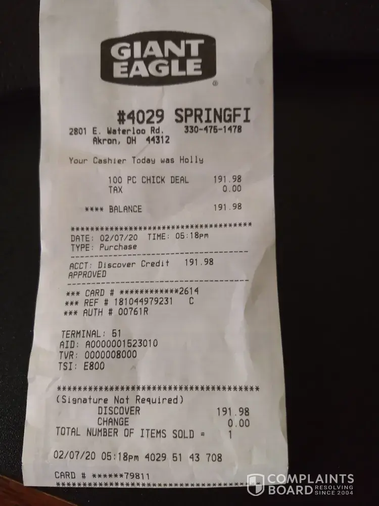 I ordered 2-(100 piece cooked chicken)for a post funeral family & friends gathering or repass. Every one of the wings had at least one (mostly 2 or 3) feathers in them. This was extremely embarrassing. The specific giant eagle was located at 2801 E. Waterloo Rd., Akron, OH 44312. In addition to poor quality the customer service was rated low because the...