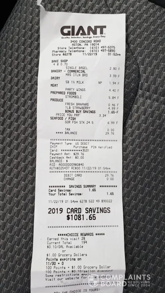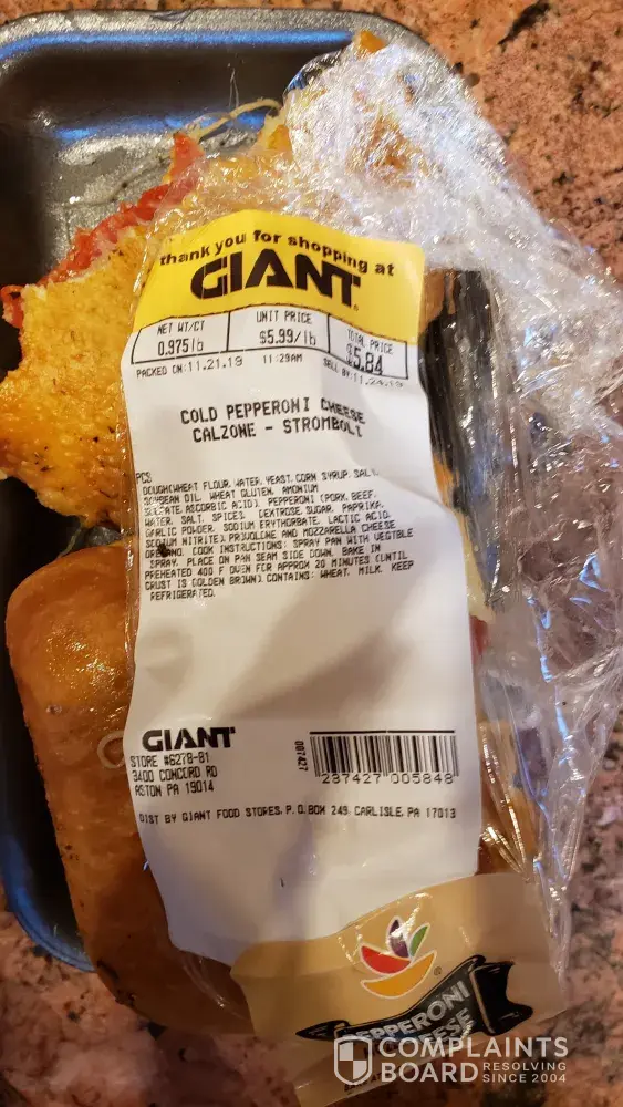I purchased a stromboli on 11-22-19 at Giant. After I cooked the stromboli I began eating it and found the entire stromboli laced with long strings of plastic melted within the cheese. One of the plastic strings got stuck in my throat which I was luckily able to pull out with my fingers. I called Giant's hotline to report the issue. They told me someone...