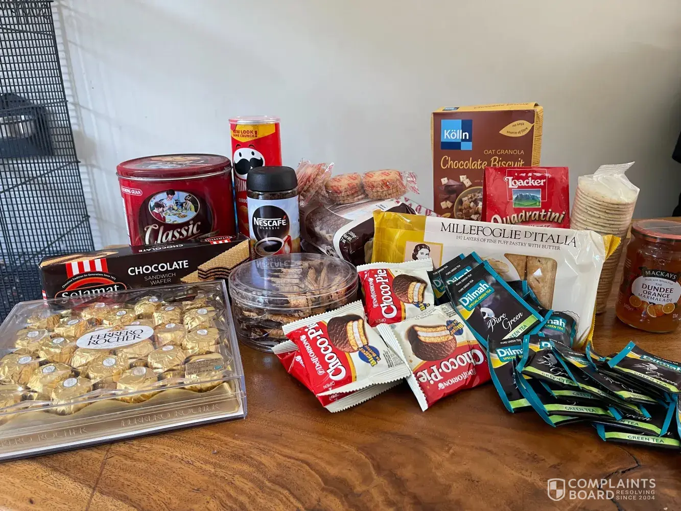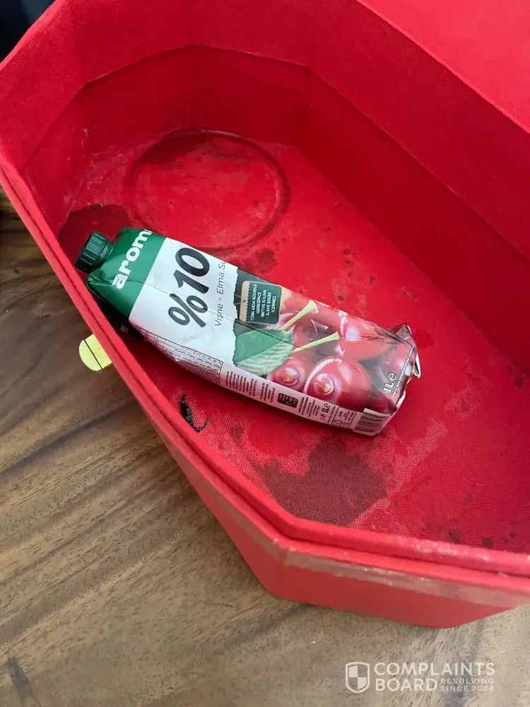 On 17th Dec I receive these photos from the receiver. Most items in the hamper looks like loose items from somewhere being put together to be called a hamper. The whole thing cost $183! Worst thing is the juice was destroyed and leaked everywhere. Completed disappointed with the quality of hamper.