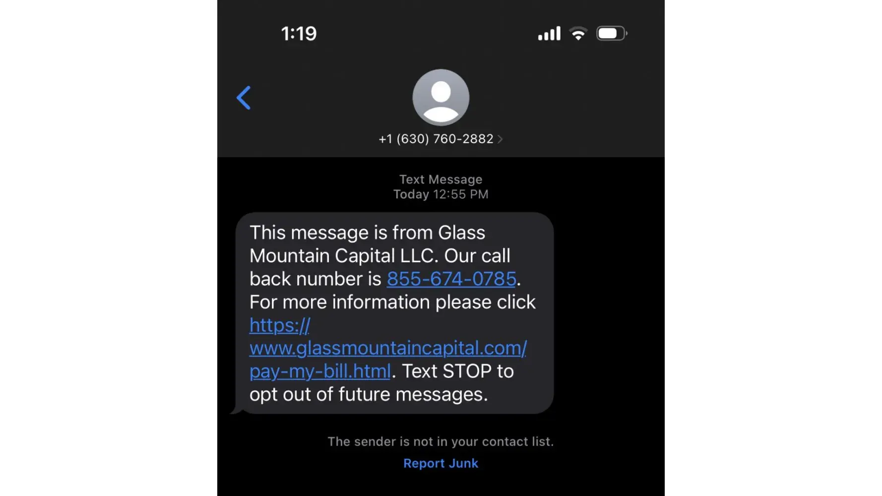I am receiving text messages from Glass Mountain Capital LLC with an attempt to collect a debt