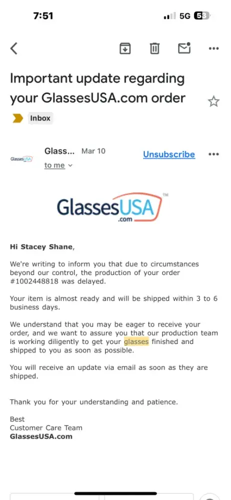 It’s frustrating when your glasses seem to be stuck in limbo for that long, especially when you’ve already waited weeks. It’s understandable why you’d be upset with Glasses USA’s lack of communication regarding your order's whereabouts. Hopefully, they get their act together and provide you with an update soon. It sounds like they need to step up their game if they want to avoid more dissatisfied customers!