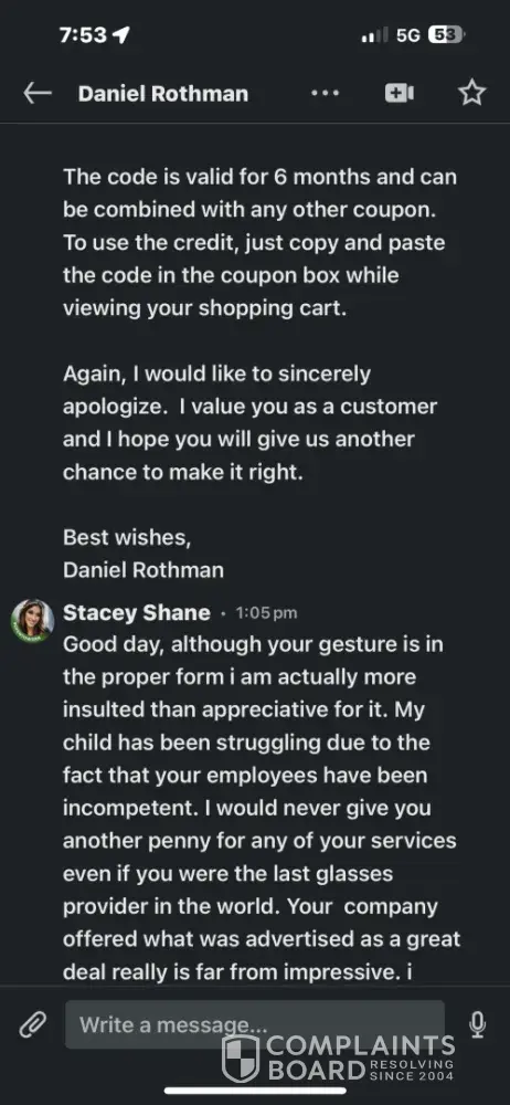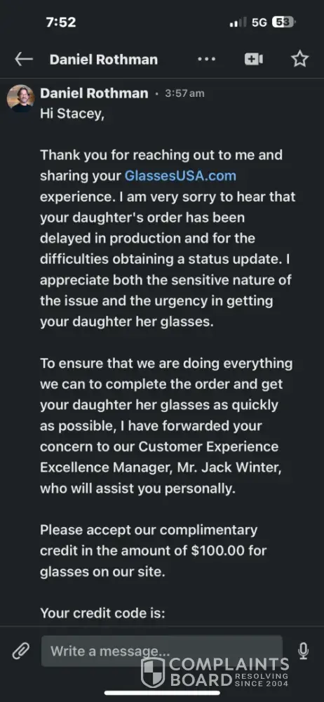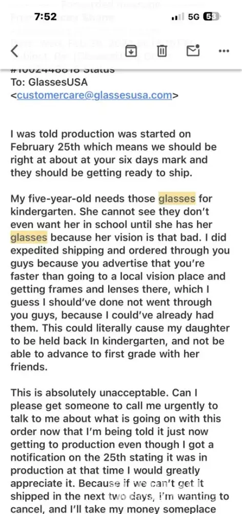 My daughter traumatized by her dad US Army Vet killed in 2022, she struggled enough from his death as she stopped communicating almost completely after hearing of his passing. Now at 5 making progress but Kindergarten is difficult due to the communication difficulties. She accidentally broke her glasses. She struggles with low self esteem and depression due to her dads death and her issues communicating and the awkwardness that comes with having a "angel daddy" which makes school and friends are hard. I ordered a replacement for her glasses urgently as her vision is bad. Glassesusa advertised how fast they are. Order February 20th today it is March 12th, speaking with customer service every day getting disgusting responses and no help and broken promises I reached out to Daniel Rothman CEO on glassesusa as my daughter was at risk of being held back as she was missing work due to her vision. He had the nerve to not help me with the order just told me he talked with Jack Winter, but then turned around and offered $100 credit good for 6 months to give these crooks more of my money and time! Jack Winter emails promising overnight delivery on the 12th and delivery on the 13th well no surprise they have not been shipped. So tonight after I left my daughters parent teacher conference I called customer service and they state they can't do anything. My daughter now gets to repeat Kindergarten as this has tremendous impact on her education. She has suffered with feeling confident as she already has communication issues now she's had vision issues which have held her back from her class and she was finally fitting in and this situation has caused her so much trauma. Most horrible customer experience and consequence i've heard of from a large corporation and to a daughter of a army veteran killed when she was 3! They aren't even USA based they are out of Jerusalem they should be banned from practicing business in the USA and my daughter should be compensated. My husband didn’t give his life so people could be treated this way it’s repulsive.