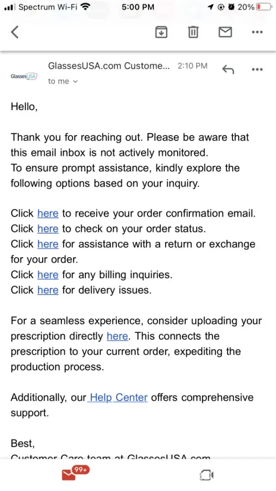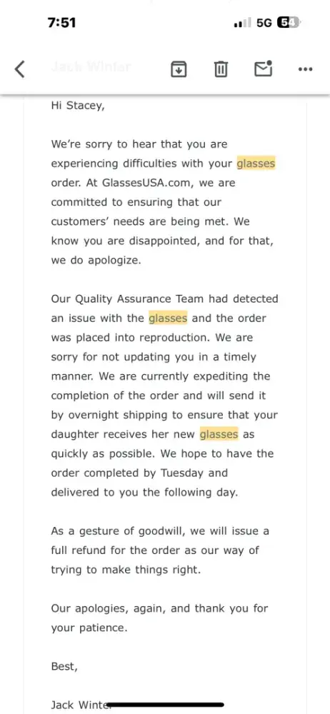 Glasses USA really seems to have dropped the ball here — no glasses for your daughter, endless emails promising their arrival, and no way to speak to an actual person? That’s a frustrating combination, especially when school’s already started. Hopefully, they sort out this mess soon and finally get those glasses delivered.