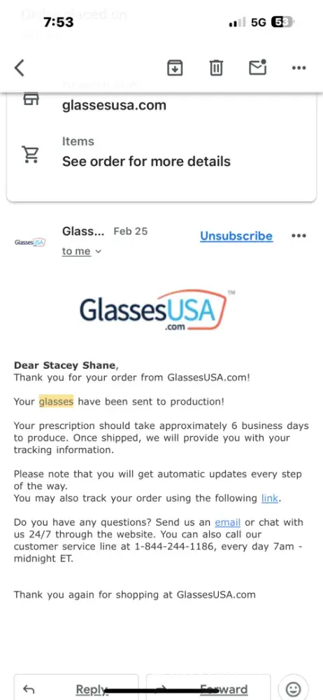 The following day on Sunday 6/09/2024 I received a text message at 3:36pm saying my glasses are ready for production. My order would be ready 3-5 days. I paid extra to have order in 3-5 business days. Today it’s well past the 3-5 business days.