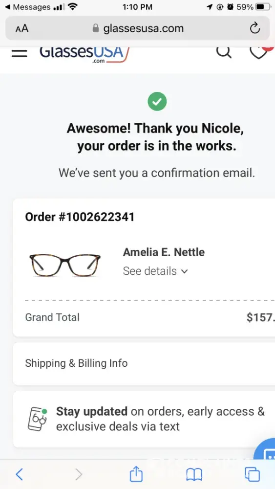 On 6/08/2024 around 1:30pm on Saturday afternoon I ordered Amelia N. Nettle pair of glasses. The total being $157.43. I screen shot the receipt order and I never received a confirmation email saying the order was processed. Order number is [protected]. However, the money was taken out of my account on 6/10/2024 of $157.43.