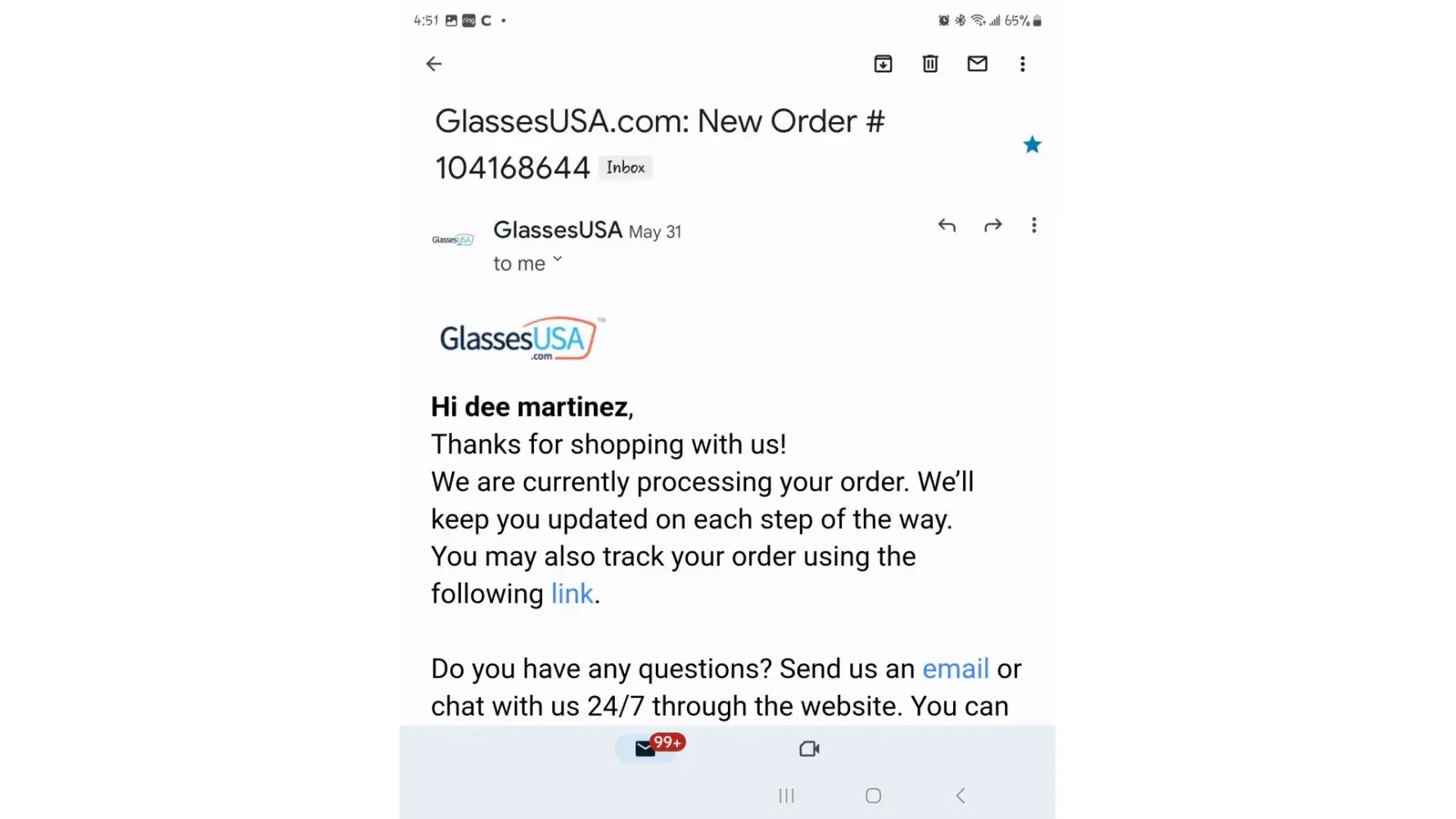 I placed an order for reading glasses on May 31st, 2023 with GlassesUSA. I then received an email that the glasses order was said to be delivered on delivered on June 9th, 2023. The United States Postal Service electronic mail update system emailed me my mail due for June 9, 2023 and the information does not show the package being delivered on the date that GlassesUSA claims.