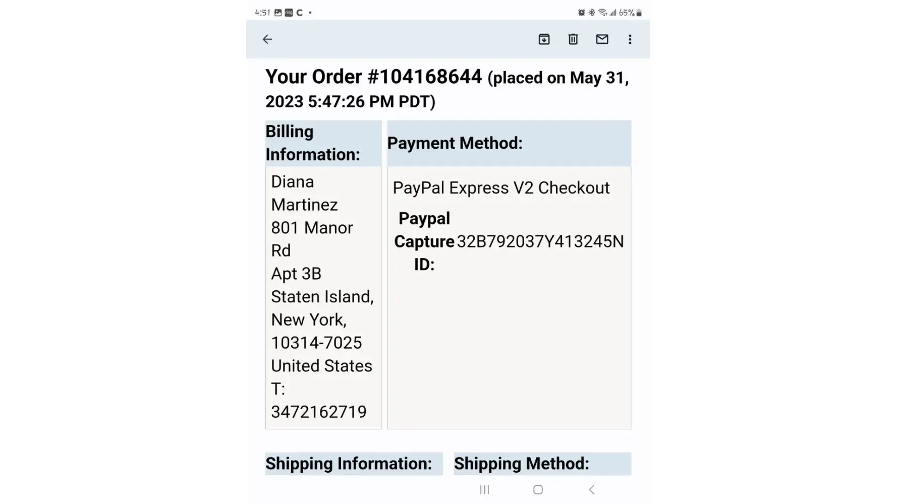 Desired outcome: Shipping label for order [protected]
