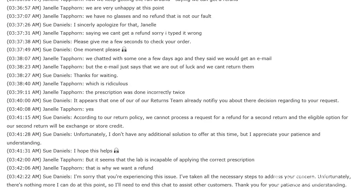 Later when we tried to get a refund they said it was against policy to return a pair of glasses that was already returned once even though it was not our fault at all.