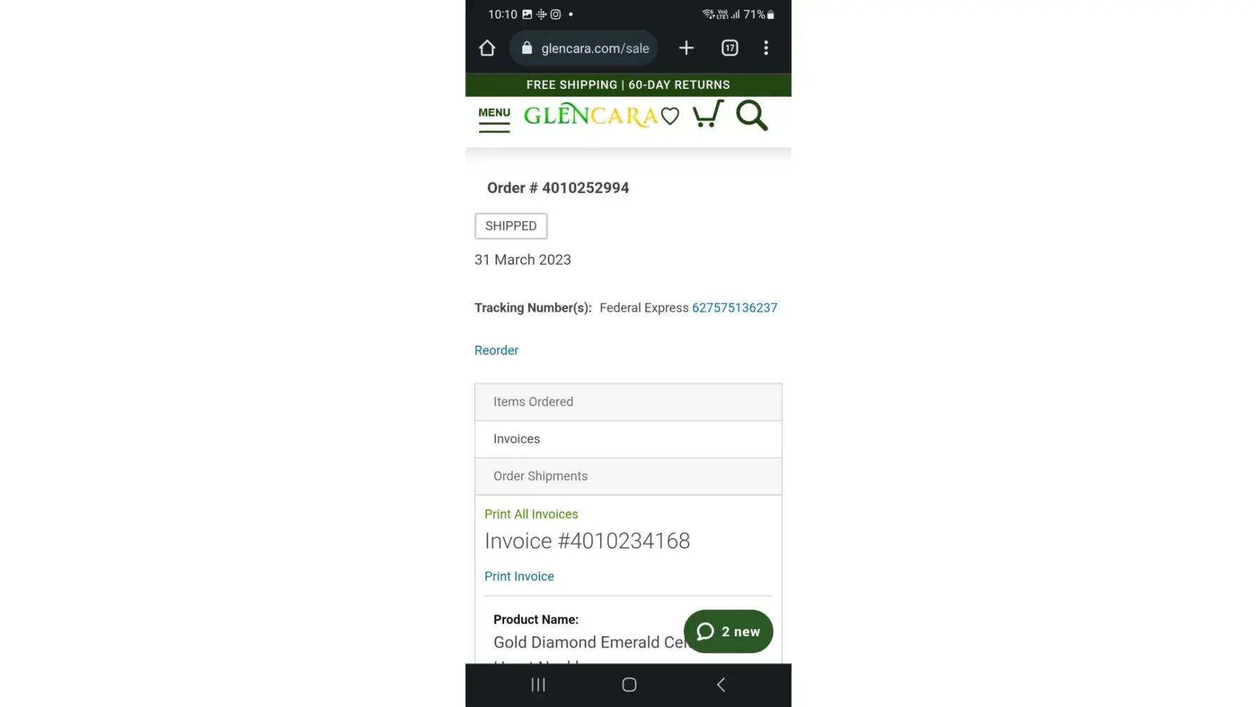 On May 1, 2023 I ordered a Gold Diamond Celtic Heart Necklace for my wife’s May 19 birthday from Glencara. The order confirmation stated its retail value at $8,128, but I only had to pay $4,383 which I did using my credit card. I was told the necklace would be delivered between May 18th and 20th but I didn’t receive it until June 2. It arrived through United Parcel Service (UPS) without the requirement for a signature confirming receipt which made me suspicious. There was not an appraisal with the necklace either which made me more suspicious.