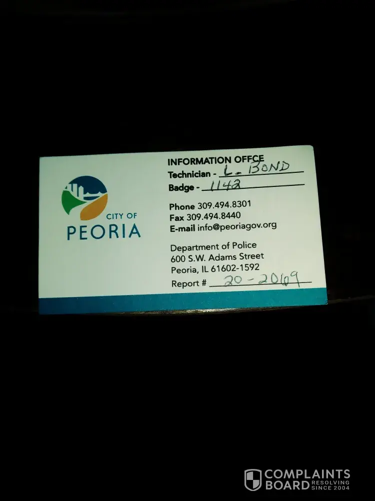 I filled a police report on or about 01/31/2020 with Officer L. Bond at the Peoria Police Department. Then, I pressed charges at the State's Attorneys Office on 02/05/2020.