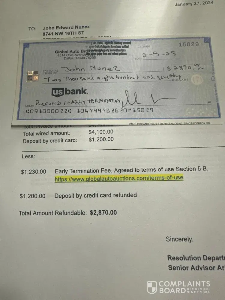 He basically says no and i will be getting a tracking info for my refund check soon. I call the auction house that sold the bike and explain to them the situation, they verify that that bike was never sold to GAA nor a Jerry. Same afternoon i get a fedex notification that a package from global auto is coming. When i receive it, its a check for about 2800 of the 4100 i wired and has a paper that says i early terminated ( even though i accepted my bike).