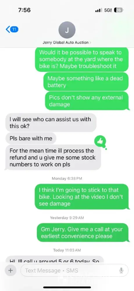 I ask him to send me pictures or a video (the video on crashedtoys.com shows no damage and is listed as running) he asks me if i want to look for another or get a refund. I text him (please see pics) to send the bike anyways (its an auction and thats what an auction is, you never know what youre going to get).