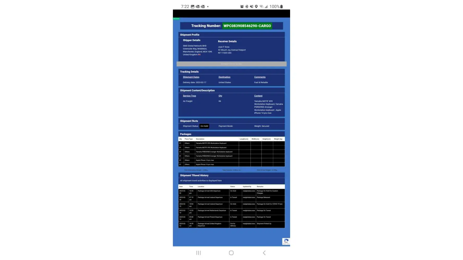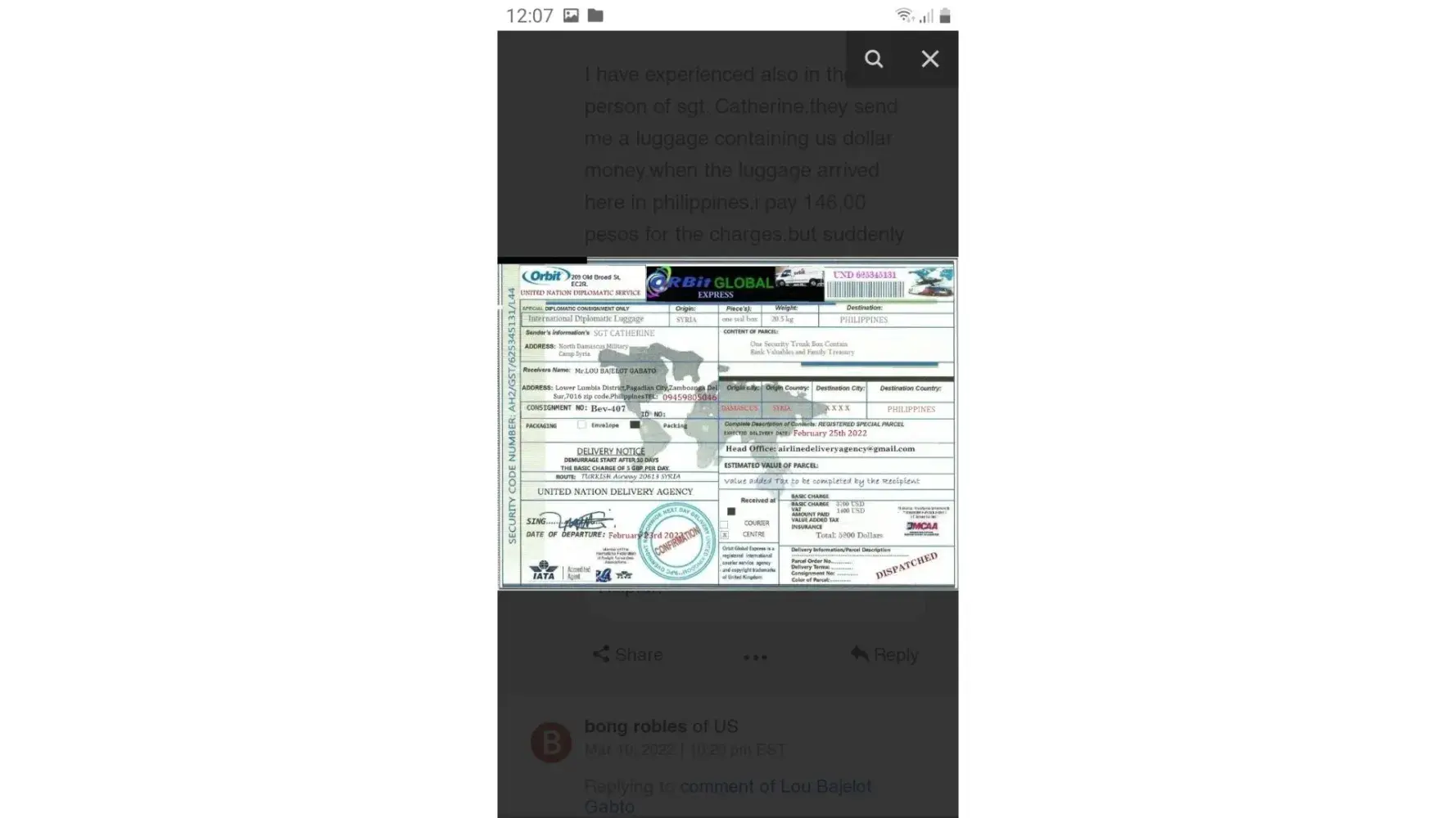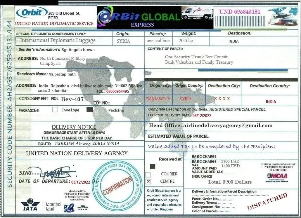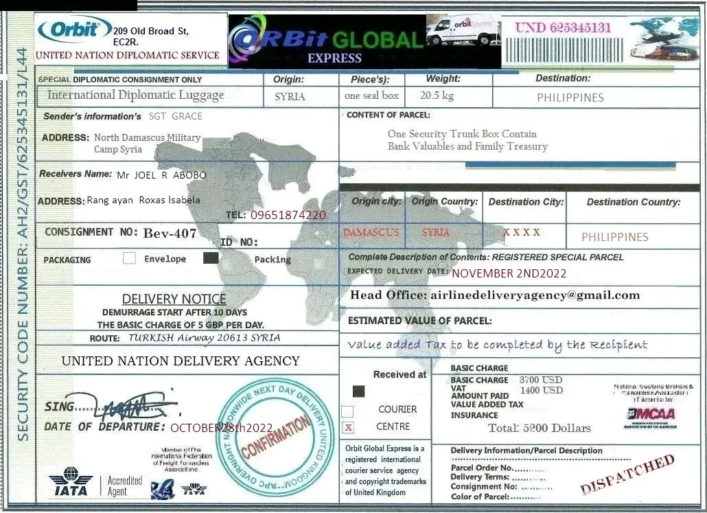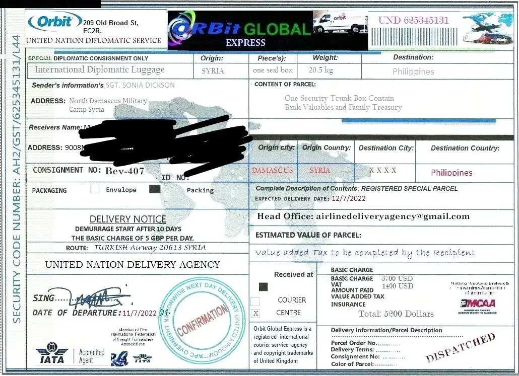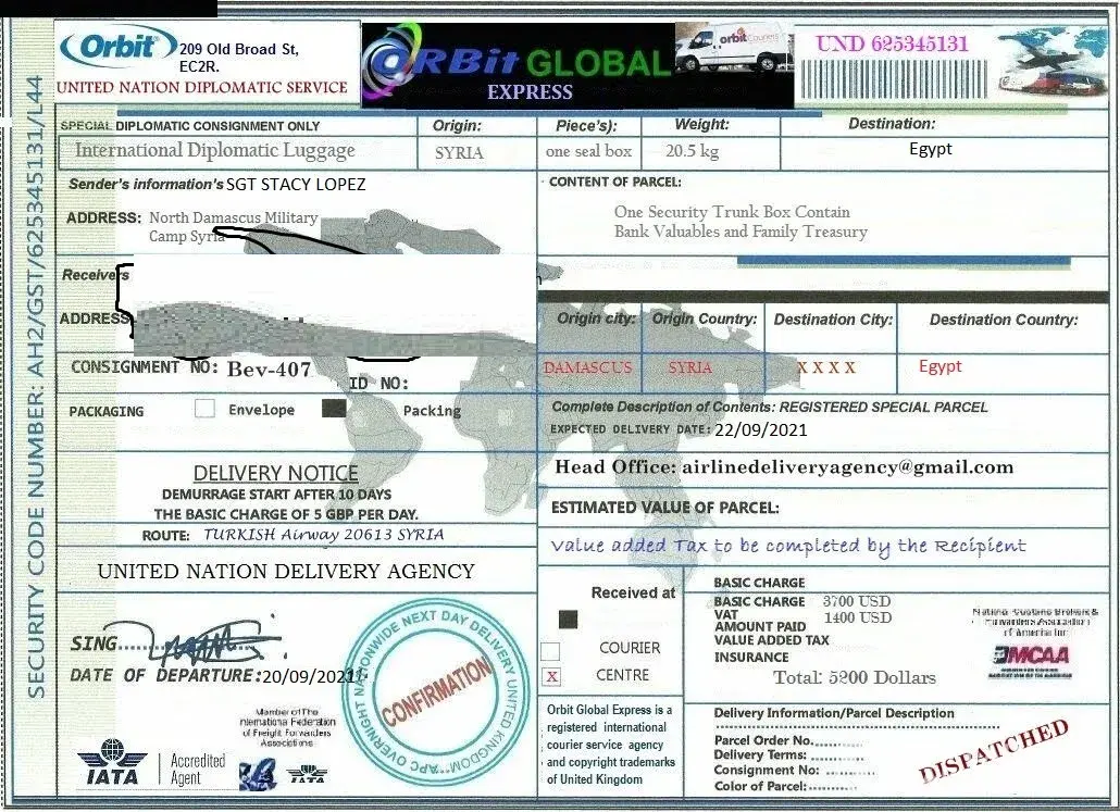لقد ØªØØ¯Ø«Øª معى وقالت انها اسمي .. الرقيب ستايسي لوبيز .. أنا جندي أمريكي Ù…ÙˆØØ¯ أعمل كقوات ØÙظ سلام تابعة للأمم Ø§Ù„Ù…ØªØØ¯Ø© ÙÙŠ سوريا ØŒ ÙÙŠ Ø§Ù„ØØ±Ø¨ ضد الإرهاب وانها تريد ان تبعث لى بطرد Ùيه اموال تريد ان تعمل بها ÙÙ‰ بلدى وعليه Ùقط Ø¯ÙØ¹ مصاري٠الشØÙ† عندما تتصل بى الشركة وادركت انها نصابه وخصوصا عندما بعثت لى بوليسة الشØÙ† بتاريخ قديم ÙØ¹Ù…لت Ø¨ØØ« عنها وادركت ان Ù†ÙØ³ البوليسه Ø¨Ù†ÙØ³ الرقم لكن المرسل له مختل٠ÙÙ‰ كل مرة وهذة بوليسة الشØÙ† التى ارسلتها لى