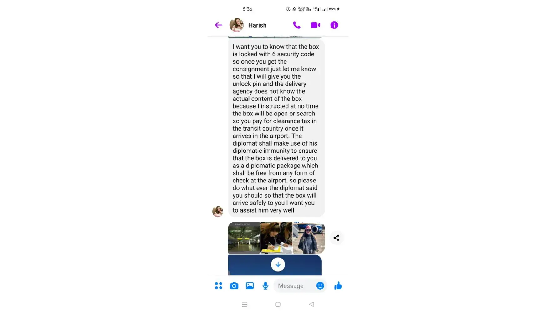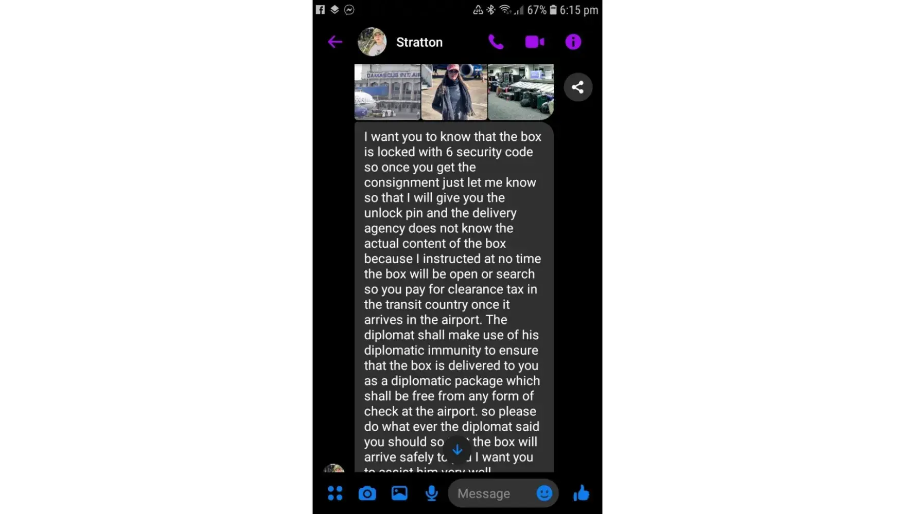 Ø§ØØ°Ø±Ùˆ من هده النصابة تدعي انها سترسل طردا Ùيه الكثير من الاموال من اجل الاسثثمار ÙÙŠ بلدي لكنها مجرد عملية نصب
