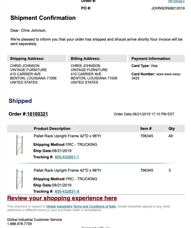 I purchased $5, 115.00 in racking 3 weeks ago. I was told it was all in stock and in the pictures you will see the sent me a shipping document indicating that all the product shipped complete. It did not, almost half the product is missing and as you see in the pictures they shipped a mixture of sizes. My warehouse receiving manger called them the same day to report the issues. The man at Global knew the order was shipped short, but he did not note it on any of the paperwork I received. Plus as you see in the pictures it is a huge mess because the racks cannot be assembled because the sizes are mis matched. The customer service person now wants pictures of the shortage, how do I picture a shortage. Their shipping person knows about the shortage. Terrible company to buy from and they have no idea how to get it right STAY AWAY! I ordered for convenience they have turned this into a nightmare.