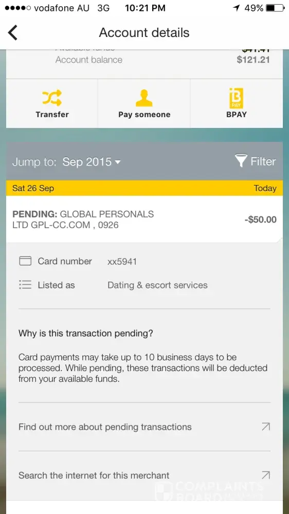This evening I received a text from my bank, stating that R495 had been reserved for a purchase @ Global Personals Ltd. I couldn't recall making any purchase of that amount & that name was not something I was familiar with. Through a Google search I find out that this is apparently a dating site. I did not register, visit or even know such a site existed before today.