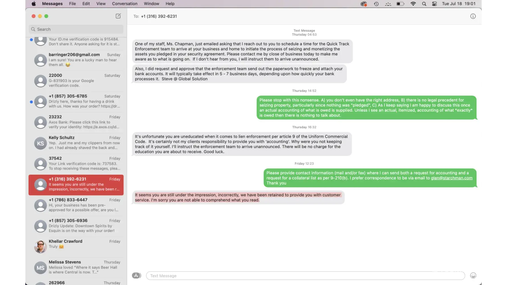 The agent is also threatening to send an "Quick Track Enforcement Team" to seize assets from my home and office (which doesn't exist) when the contract signed with Bitty Advance explicitly states my business bank account (which also no longer exists) as the only pledged asset for the loan.