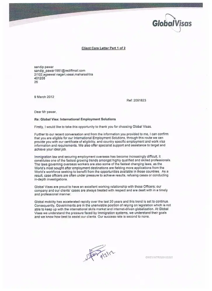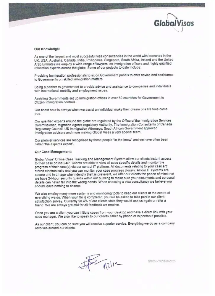 By seeing all the reality which I described earlier in detail about professional negligence and inappropriate services full of false claims of success and fraud agreement never signed provided by global visas to me, I am fully qualified for full refund according to their own so called client care letter.