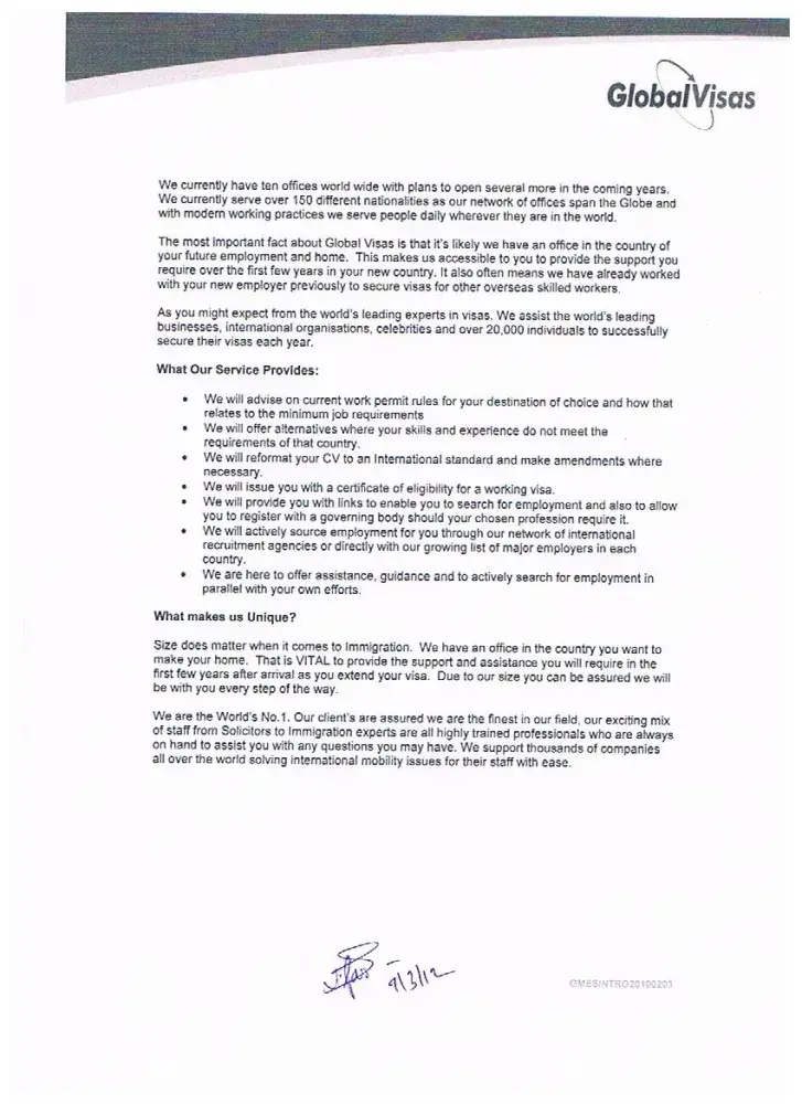 I have had little to no assistance from global visas in regards to our visa application. Once they have the money they dont want to help you. They send our cv out to job openeings that my husband does not even qualify for for, and the cv has errors that they need to fix, but they still send it out just like that. Never use global visa!