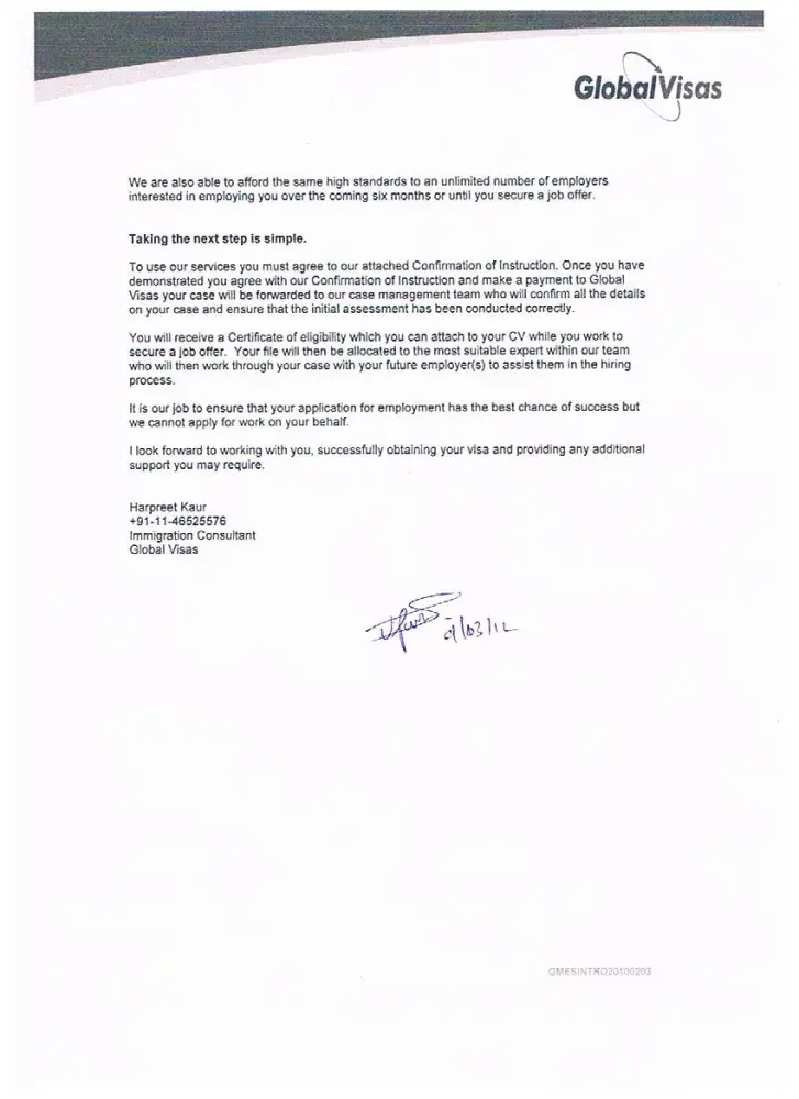 I started my free assessment on GLOBAL VISAS website to check whether I qualify for the CANADIAN IMMIGRATION or not. Very next day I received a phone call from customer services representative (SHARMIN) and we arranged a meeting in the second week of November 2012.They sent me a ‘SO CALLED CLIENT CARE LETTER’ and I took it into the meeting to understand all the points. She told me it doesn’t relate to your case and you will get the right one according to the terms and conditions which we will decide. She started discouraging me about the genuine CANADIAN IMMIGRATION although I was eligible for it. In the meantime she started giving me advice about LIVE & WORK in CANADA. She gave me poor advice and was making false claims of success while representing global visas. She told me, ‘securing a job in Canada is not a big deal for global visas as they have very good links with the employers and have their own recruitment agency. We will secure your job and then we will apply for LMO (LABOUR MARKET OPINION).We will amend your CV according to international standards and start searching for jobs on regular basis. You will see the results and if global visas will be unable to secure a job, a full refund will be given’.
