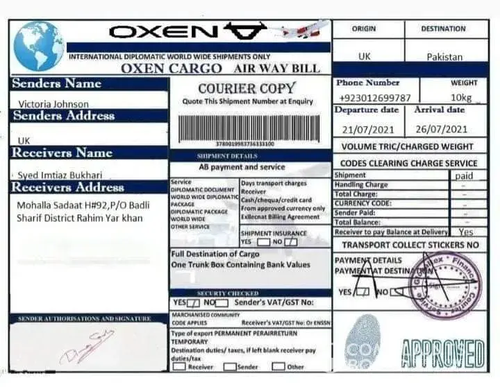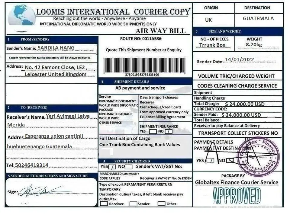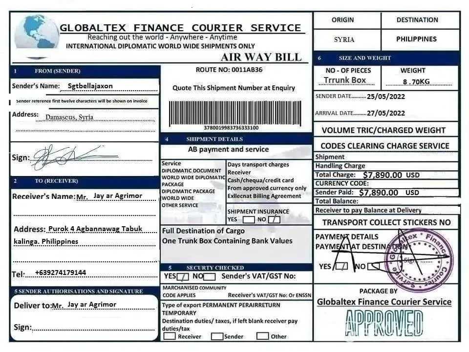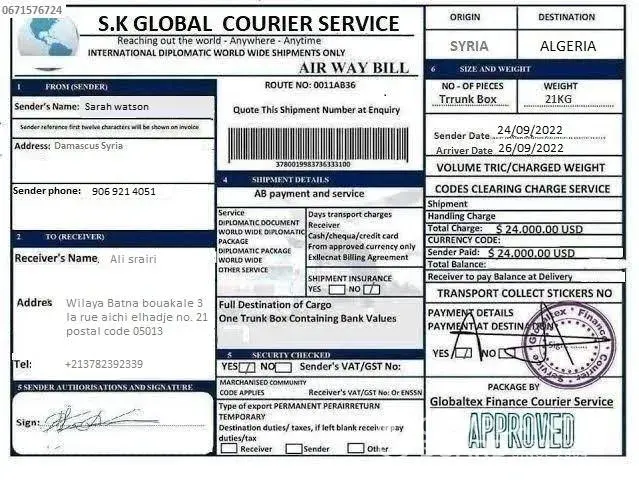 Why not send the box without anything the receiver to pay for? if it legit why agent ask money for the one who receiveth? I am just curious about... I smell like fishy! some kind of froud. inside the box some kind of huge of money... but cannot afford and shoulder to pay it all... wow! an amazing cript of craft and scratch! tell it to the marines!