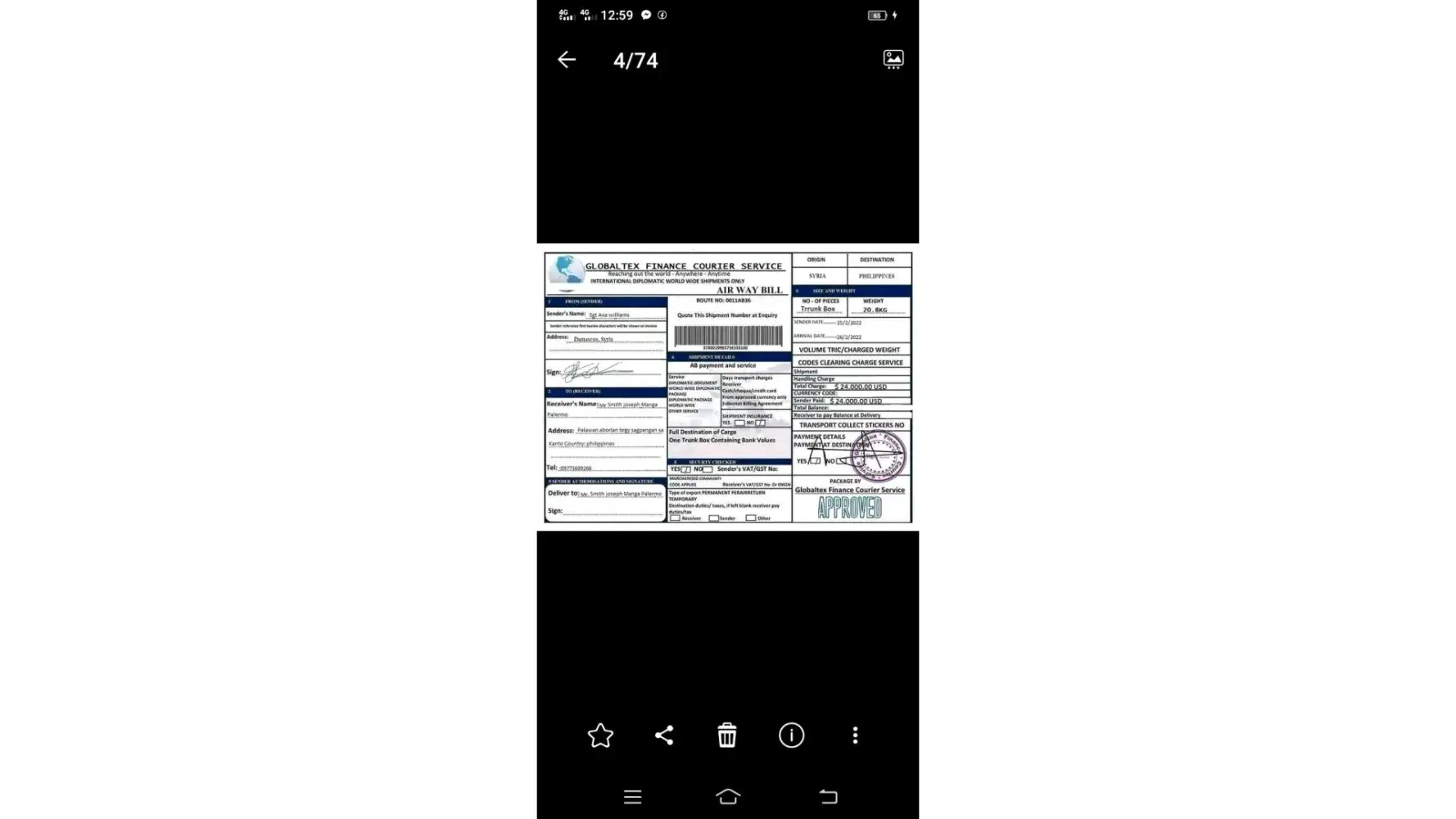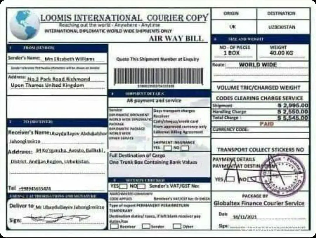 It's scam, it is the same signature I have with the parcel sent to me but of diferent name on it.