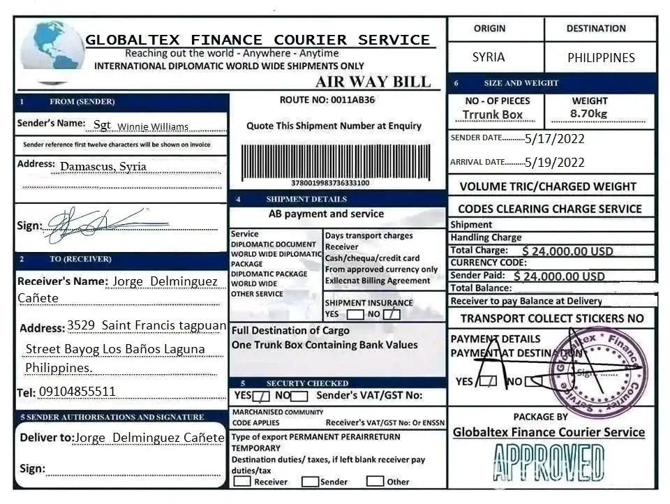 I would like to ask and wish for the trruth answer, pls! Do i need to pay the diplomat service from there in your branch at Damascus Syria, whenever it arrives to my country Philippines? For amounting 25, 000 PHP, for custom payment here in airport?