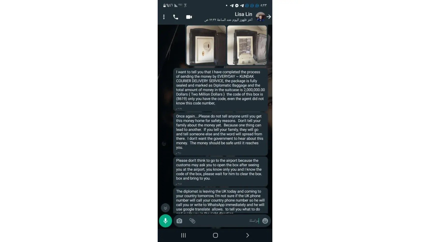Tnaong q lang Po .. nirecieve Nyo Po ba ung package ? Anu pong laman .. ngaun Po kasi Meron ding magpapadala daw saakon ng package .. galing Syria . Maletang may lamang Pera ..