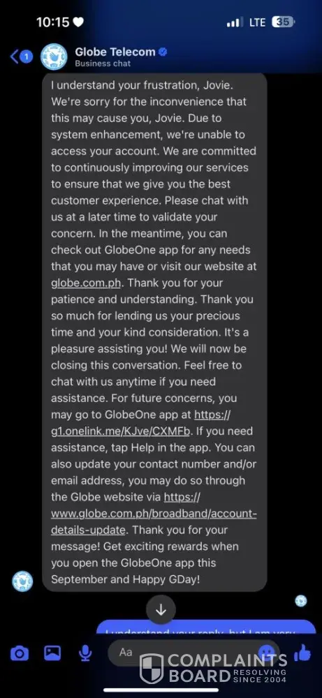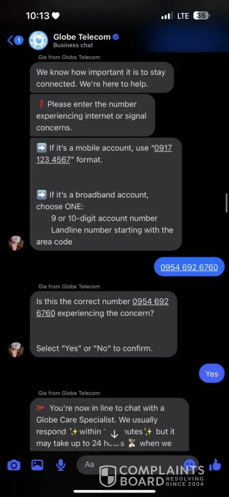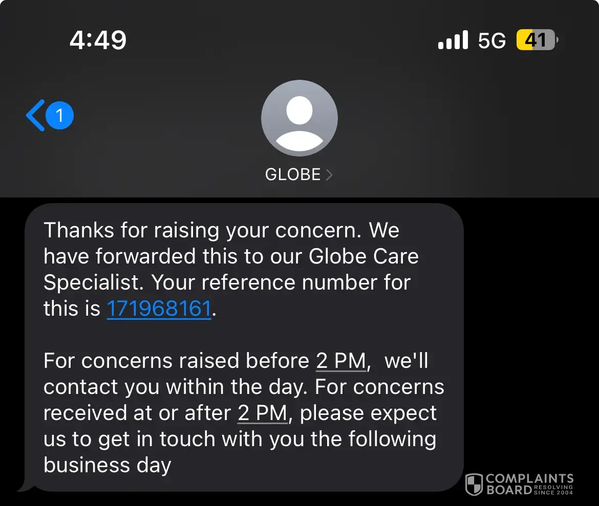 - While Globe Telecom has a high level of trust, our investigation has revealed that the company's complaint resolution process is inadequate and ineffective. As a result, only 5% of 641 complaints are resolved. The support team may have poor customer service skills, lack of training, or not be well-equipped to handle customer complaints.