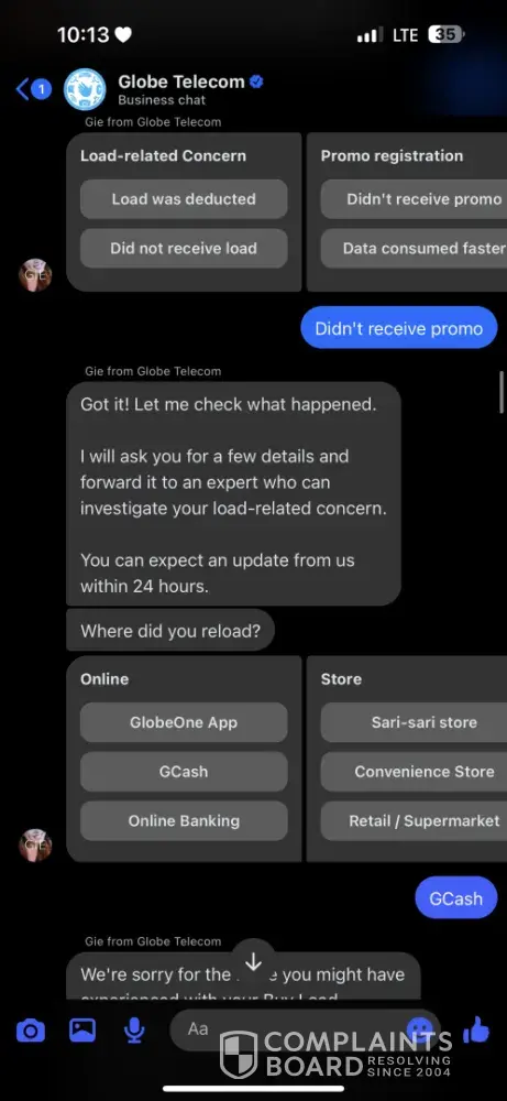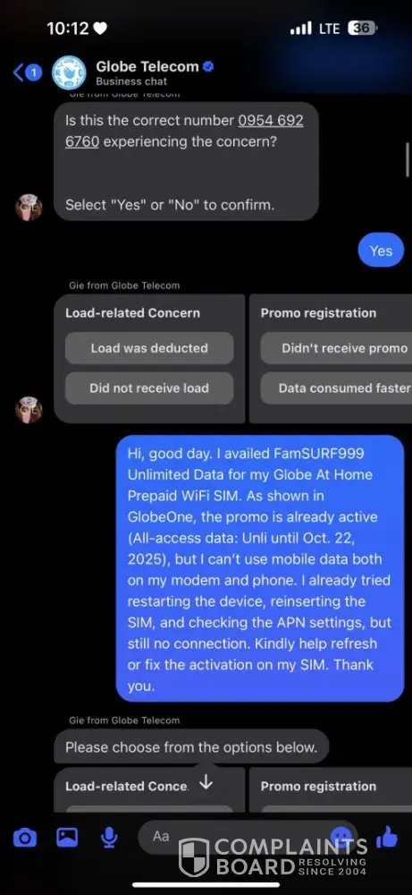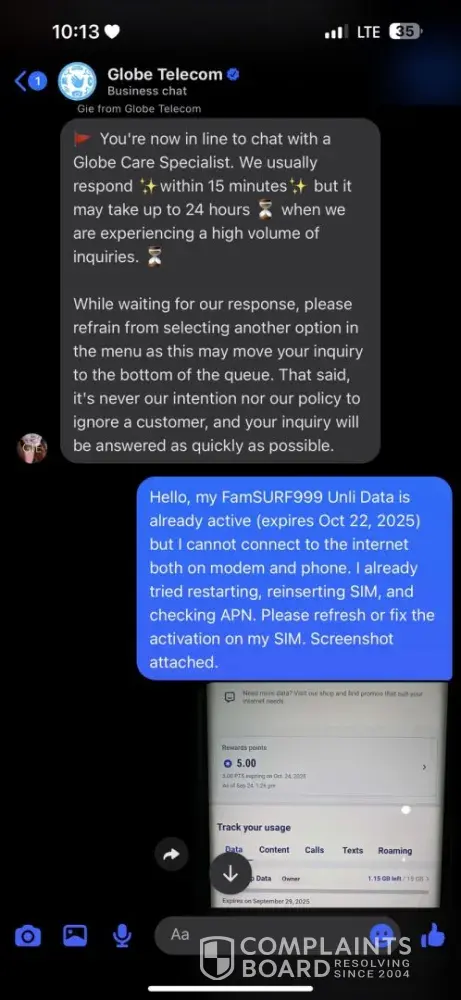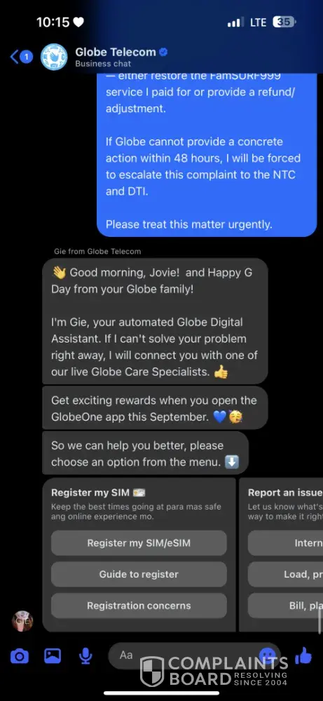 Read full complaintSubject: formal complaint against globe – non-delivery of famsurf999 promo