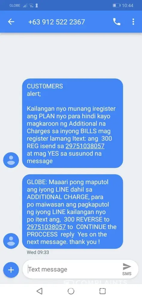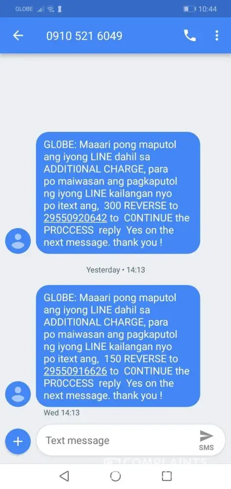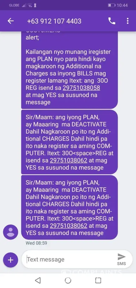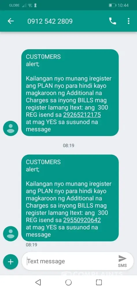 I have been a postpaid costumer of globe for the past 4 years. After I have recontracted my plan and added a new additional line last april 16, 2019. While my recontracted plan with new phone was successfully processed with up to date advices and messages, I was surprise to not receive the same kind of advices and messages for the services to be inputted in the new line and phone. Instead, I have been receiving a regular text messages from different numbers 09125422809, 09105216036, 0912 542 2705, 0912 535 7318, 0910 521 6049, +63 912 522 2367, +63 912 107 4403 and more.. With almost the same kind of advice that: I still need to register the plan because it might get deactivated because of additional charges and because this number and plan is not yet registered in "our computer". To me this is clearly an inside job by some of your globe employees who have access to sensitive information. I seek explanation and clarification for this continuing incident. It is not right, it violates my data privacy and it creates undue stress to your user. I have screen shots of all messages uploaded below. Please do something to correct this.