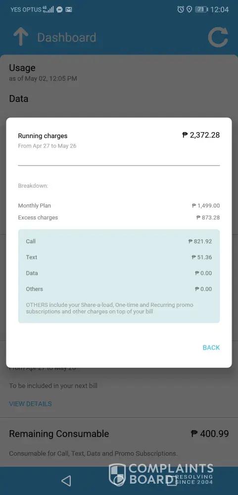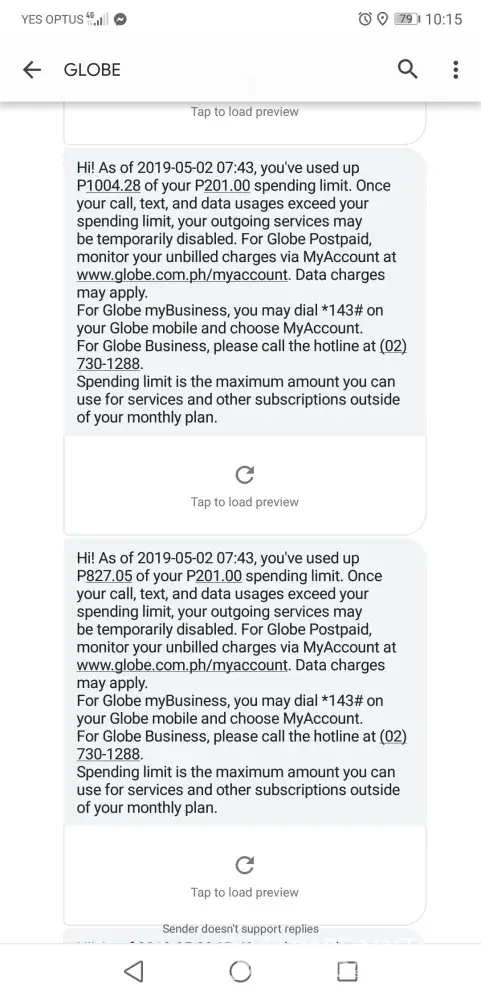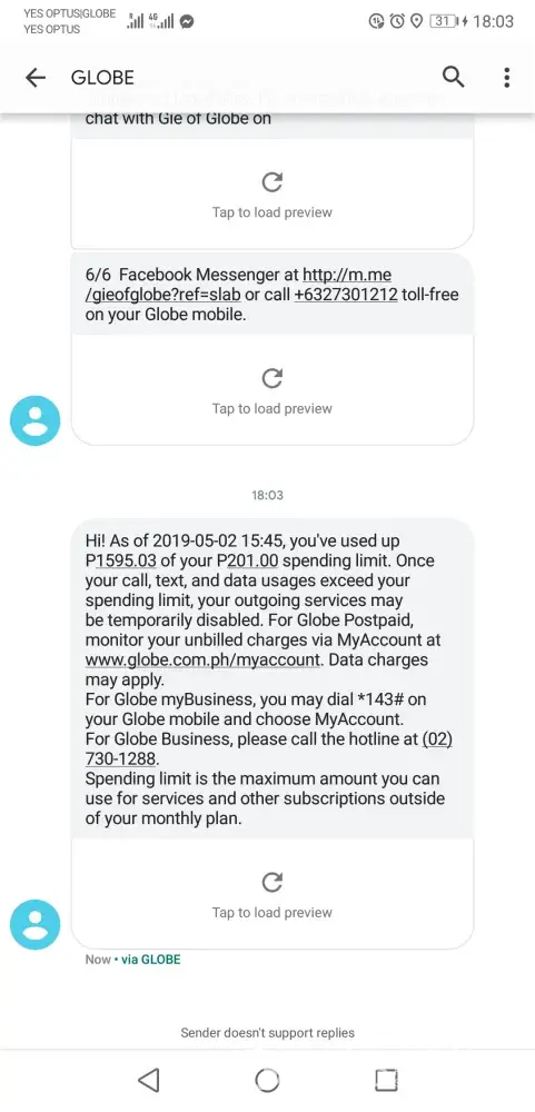 (Hi! As of 2019-05-02 15:45, you've used up P1595.03 of your P201.00 spending limit. Once your call, text, and data usages exceed your spending limit, your outgoing services may be temporarily disabled. For Globe Postpaid, monitor your unbilled charges via MyAccount at www.globe.com.ph/myaccount. Data charges may apply.
