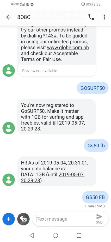 Firstly, I bought a load yesterday thru my gcash account and this was the output :*(P20.00 prepaid credits was loaded to ur mobile# [protected]. Trace No: [protected] 05/04/2019 08:31PM.) But then when i check the balance this is the result*(Hi! Your load balance as of 05/04/2019 08:39 PM is 0.50, valid till 05/03/2020 08:32 PM. You have 0 texts to all networks. Thanks!).
