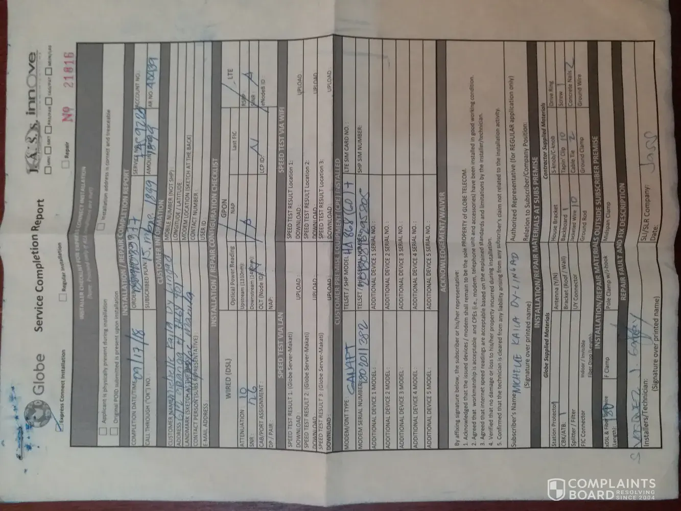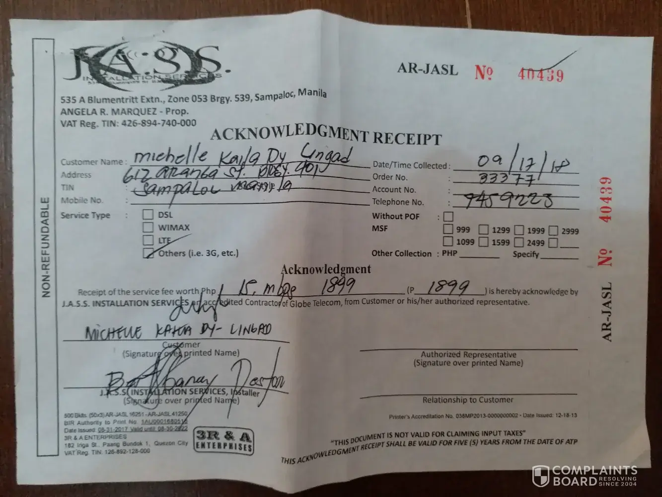 On September 17, 2018 I contracted with you for Plan 1899. 2 weeks before that, I have been contacting and exchanging calls with ROMY PAGASPAS, your team leader assigned in our area. ROMY PAGASPAS, the team leader, S. VASQUEZ and J. GARAY the installers were the people I spoke to when they are installing my plan at our house. I entered into the contract on the basis of being provided with estimated speeds of 15mbps. I have attached the receipt of the cash advance of P1899 that I paid for. Please see for your reference. I also gave extra to the installers and the team leader for their effort on that day.