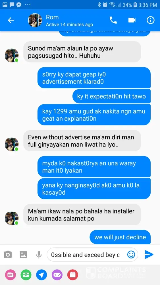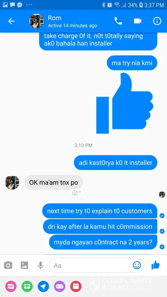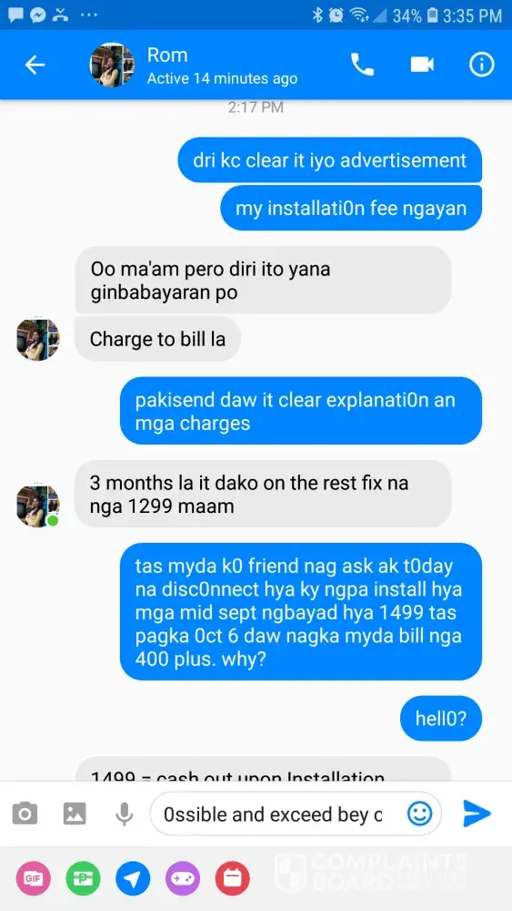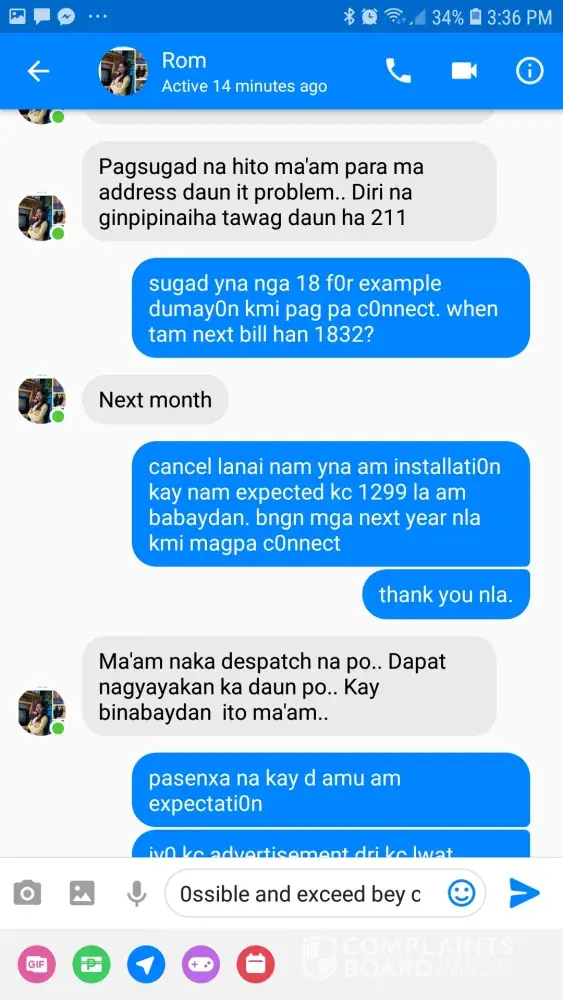 I have established to my satisfaction that the problem is beyond my control, and that you are not providing the service I am going to pay for. ROMY PAGASPAS is not updating me regarding the matter. I want him and the installers to fix what they have done because it really is a hassle to me because I am a mother of two and I work online, so it is essential that I have internet that is functional. I request you again to send someone from your office to check my connection. I expect a quick response as satisfying your customers should be your first priority.