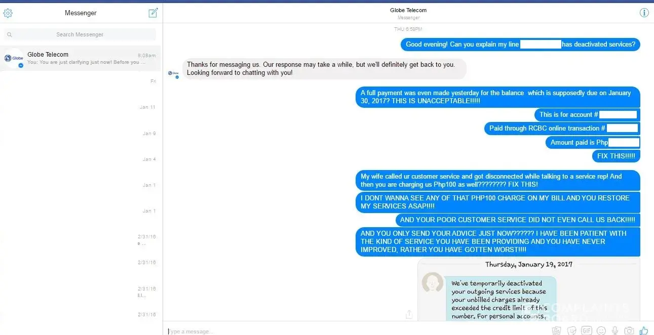 Even after full payment they deactivated my line services then had my wife cs, call got disconnected, my wife had to call them back then another worst thing is the previous rep she spoke with, made a note that it was a drop call and that she tried to call my number multiple times but there was not even a call initiated that is why my wife had to call again. the second agent who answered my wife's call was able to assist. funny thing, it was after that call only then I received a notification that my service was deactivated. shouldn't the notification sent prior to me finding out my services were deactivated? then on fb messenger, they asked me to pay my unbilled charges, when I did get a notification I did not have any. we just went to sleep and then there goes the unbilled charges and they are asking me to pay?! I have all the screenshots and when I went back at them telling this, I was then advised that the unbilled charges are not final, that charges can only be validated once final bill is in, which is next month. but hey that was not the advice I got previously, they only changed their tone when I said I have all the documents and they are clearly liable, the tone then changed. if there is word more than "worst", that's the best word to describe them!