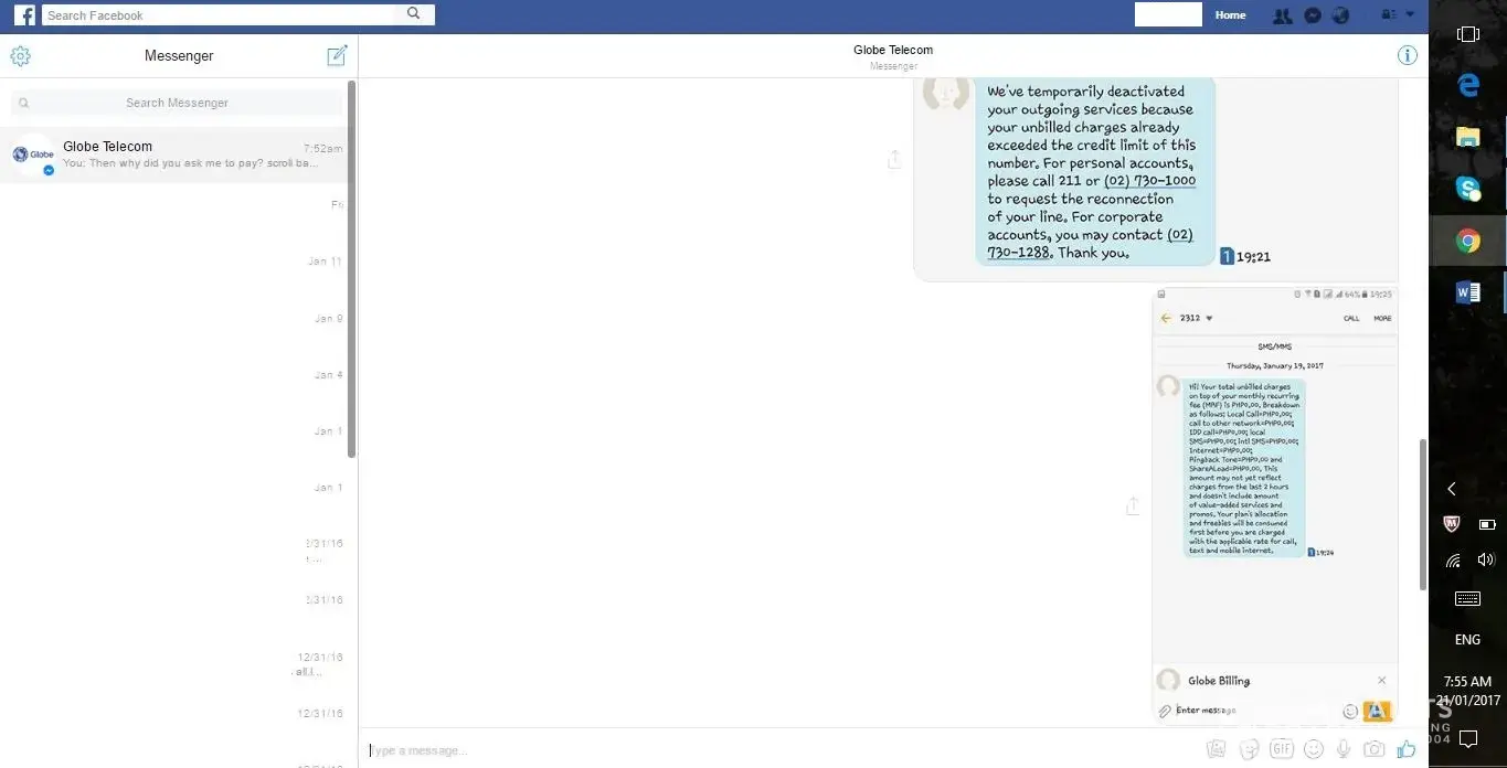 We are under plan 1599 and the package includes unlimited call to Globe and TM numbers. This all started January 12. We were trying to call a Globe number when the voice prompt started saying that we are restricted from doing so. Thinking that it'll be resolved by itself after few days, we ignored. Come January 14, we started experiencing flactuating internet connection which later on totally disappeared. Thinking again that it will be resolved by itself, we ignored.