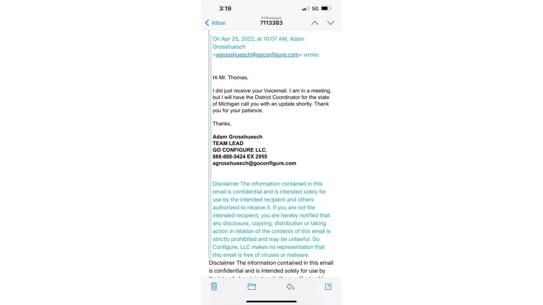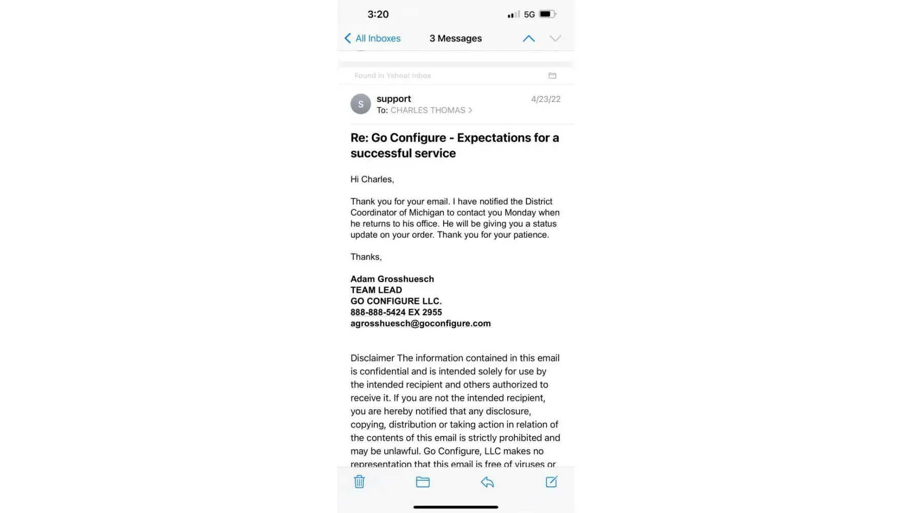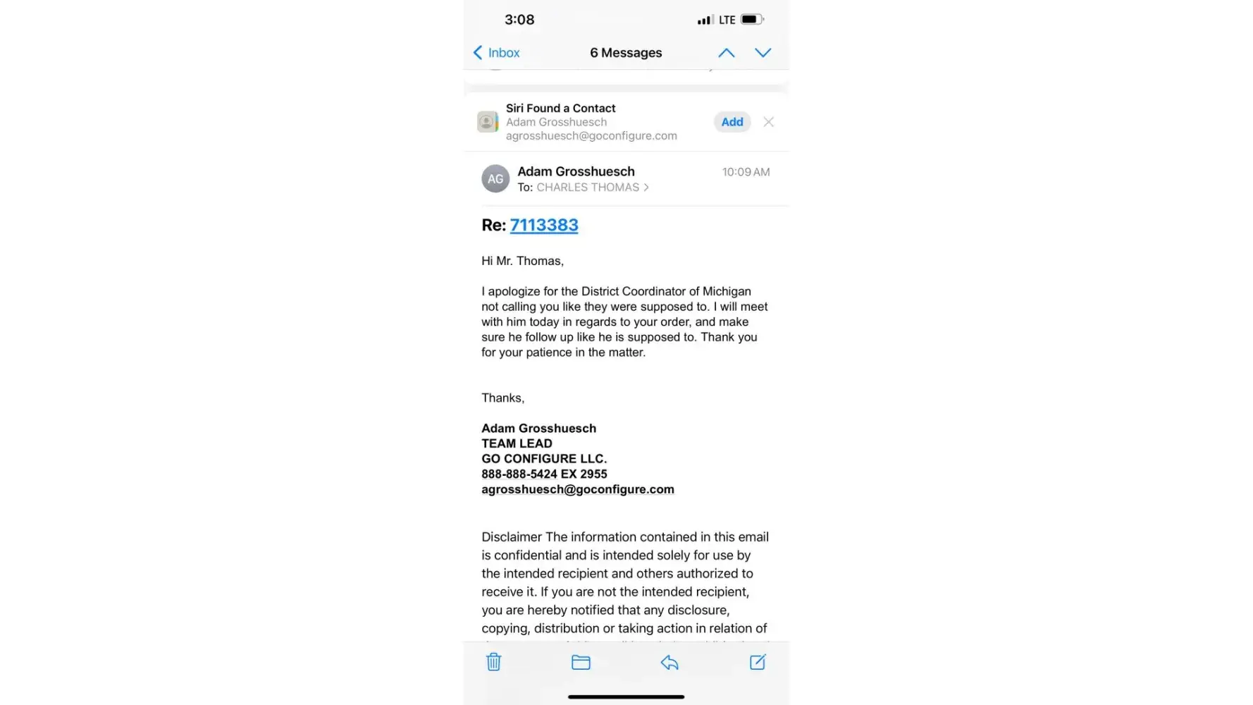 Again, no call, no tex, no email. After several calls, my husband was told that the order was never placed and it would be done immediately. After more than a week again, the parts came. We reached out to the installer to let him know and were told that we had to go through Co Configure. Which of course we did, but got another song and dance about being contacted by the next day with a date and time. That call never came. Again, we called and were told the same thing. This is the reply we have been getting for the last three days. No call comes, no text, no email.