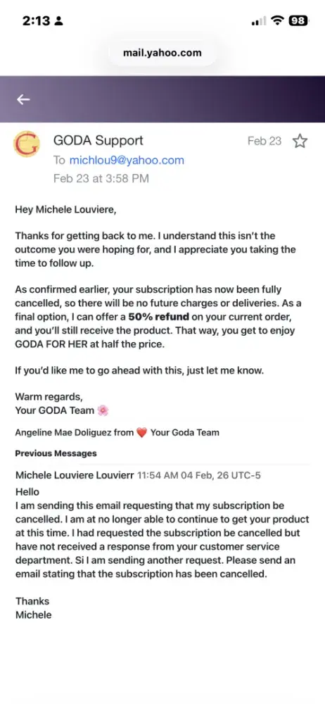 I continued to get their automated special offers again. I asked for the auto emails to stop and I requested a supervisor’s email and or phone number to fix their error in sending this product to me after the subscription had been cancelled. Unfortunately I never got neither because there is not any of that information on the site. Just the continuous auto emails. I contacted the Better Business Bureau and explained my problem. Since then I have not received anymore emails and still waiting to see if they will refund me as well as refund the shipping of the product due to their error and not mine.
